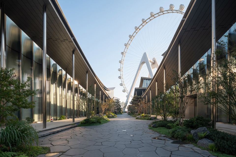 水面如镜,将建筑轮廓、乔木枝桠、天光云影尽数收纳,远处摩天轮的弧线成为空间的点缀,形成“动与静”“硬与柔”的巧妙平衡。空间设计摒弃繁复装饰,以极简手法营造出素雅纯粹的景观氛围,让参观者在静思中感受艺术与自然的共生之美。