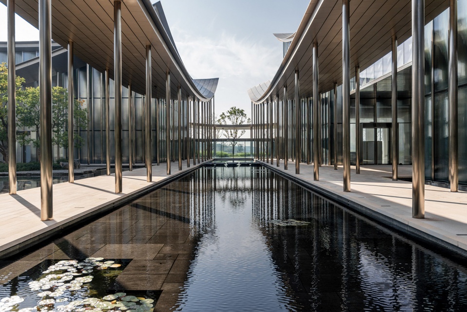 The landscape design extracts two of the most vivid elements of Suzhou classical gardens—the grace of water and the simplicity of stone—as the recurring motifs throughout the design. One intangible and one tangible, one dynamic and one static, they echo the yin-yang interdependence in the philosophical thinking of oriental gardens: water softens hardness with its gentleness, and stone conceals sharpness with its simplicity. The serene beauty of water subtly tempers the rationality and coldness of the building’s steel structure. Unassuming yet vivid, it allows light and color to flow freely on the shimmering ripples—the morning glow and evening shade, the clouds and skylight, all become tangible through the still lake. The mirror-like water surface reflects the building’s edges and the skyline’s contours, melting the rigid geometric lines into a gentle embrace.