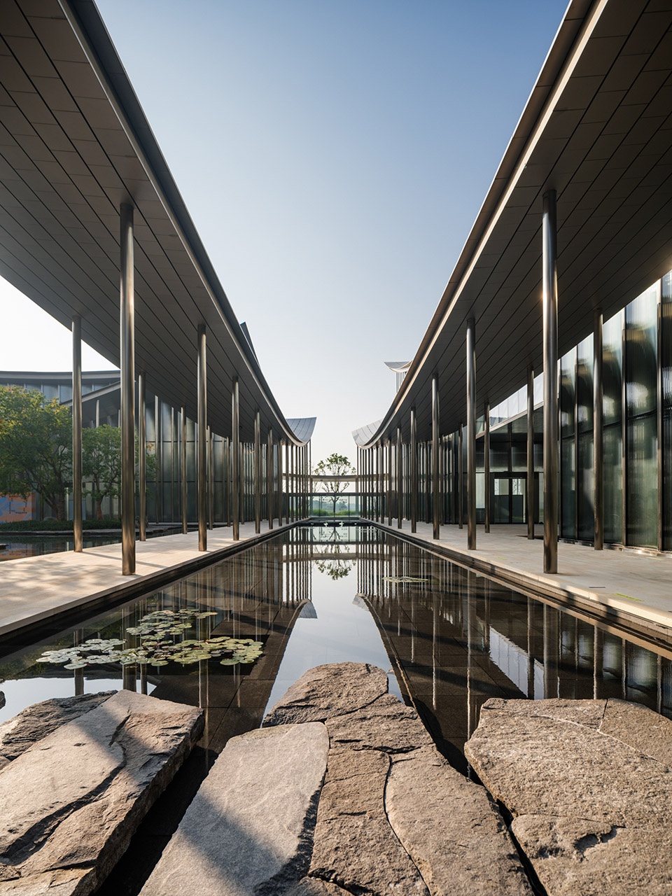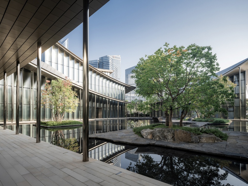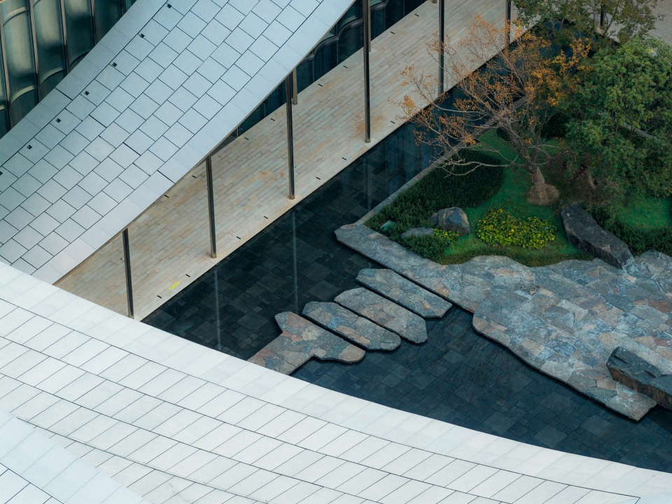 景观提炼苏州园林最为灵动的两种元素——“水”之灵与“石”之拙,作为贯穿设计的母题。这一虚一实、一动一静,恰如东方园林哲思中的阴阳相生:水以柔克刚,石以拙藏锋。水的静美,悄然调和了建筑钢铁骨架的理性与冷峻。它不张扬,却让光与色在波光潋滟间自由流转——朝晖夕阴,云影天光,皆因这一池静水而变得可触可感。水面如镜,映照着建筑的棱角与天际的轮廓,将硬朗的几何线条融化在一片温润之中。