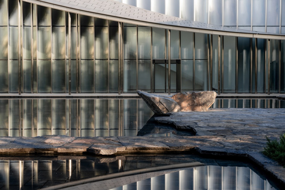 水与石,与建筑中那些标志性的现代材料——钢的冷峻、玻璃的透明——形成强烈对比,又在微妙间达成调和。它们如一对默契的舞者,刚柔相济,虚实相生,共同编织出一幅既当代又东方的山水长卷,凝固为时间与光影交织的温度。