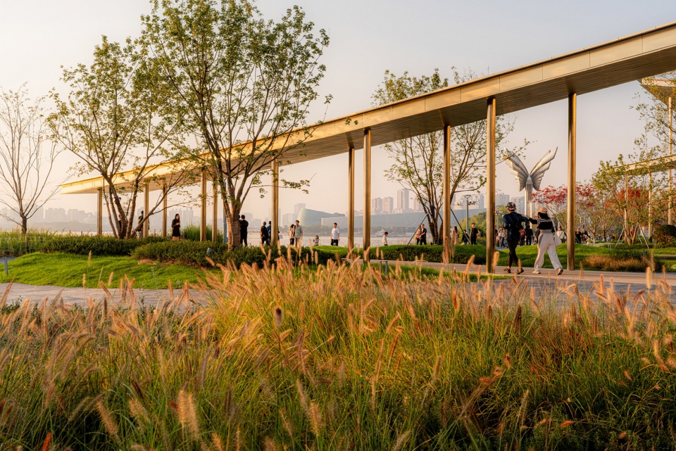 夕阳漫照之下,花庭草木承载着自然的温柔,蓬松草穗缀以光影,曲径顺着地形肌理蜿蜒延伸。此处延续建筑与自然“刚柔相济”的设计理念,起伏草坡模拟自然肌理,与连廊、建筑形成景观呼应,打造出兼具自然野趣与艺术质感的滨水花境空间。