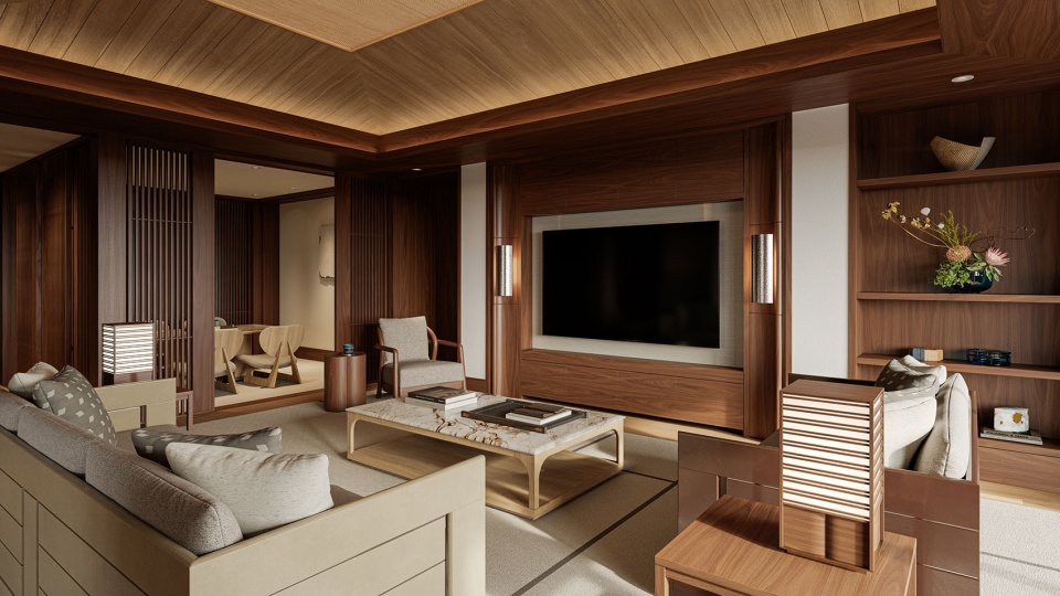Shared spaces throughout the hotel reference traditional Japanese architecture while serving distinct hospitality purposes. The Living Room, conceived to evoke a Japanese-style andon lantern—a type of lamp with a wooden frame and paper covering that provides soft light—serves as an intimate gathering space for guests.
