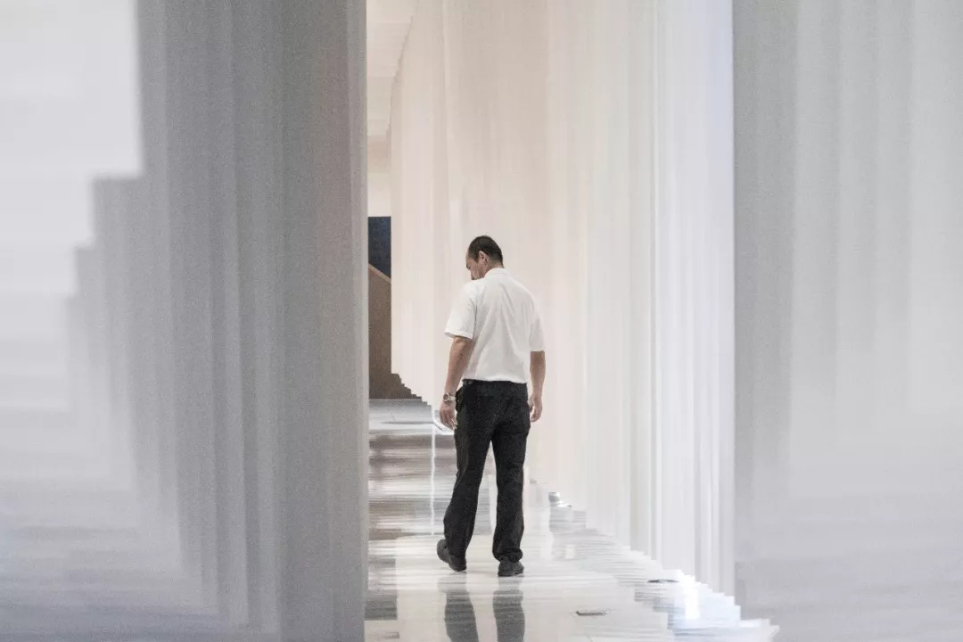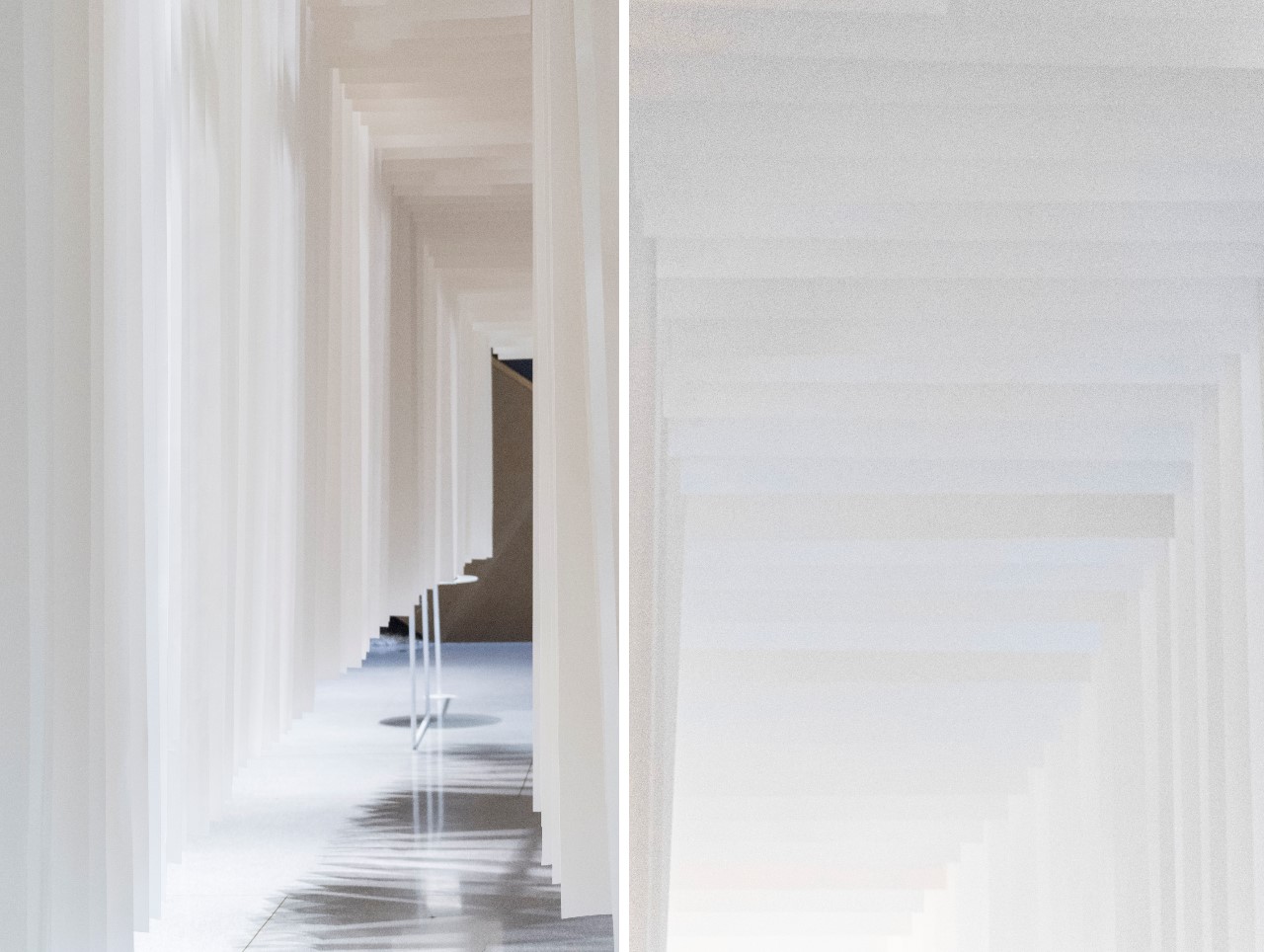 以552张纸片搭建出一条的通道,最窄之处仅够一个人通过。经过这座一个人的通道,光影流连,书页婆娑,书页建构起的厚度像一座城堡,过滤了时光,阻隔了声音,让人不受外界的打扰。穿过这条贯穿中庭的通道,希望你能迎来一次自我的新生。然后,可以更好的阅读。所有纸张可以在展览结束后可以用于后续回收利用。