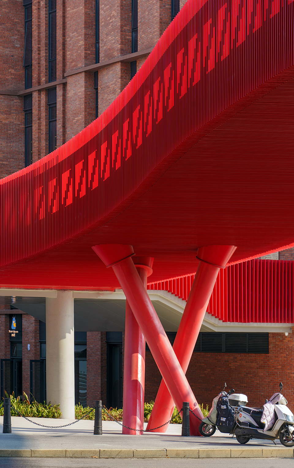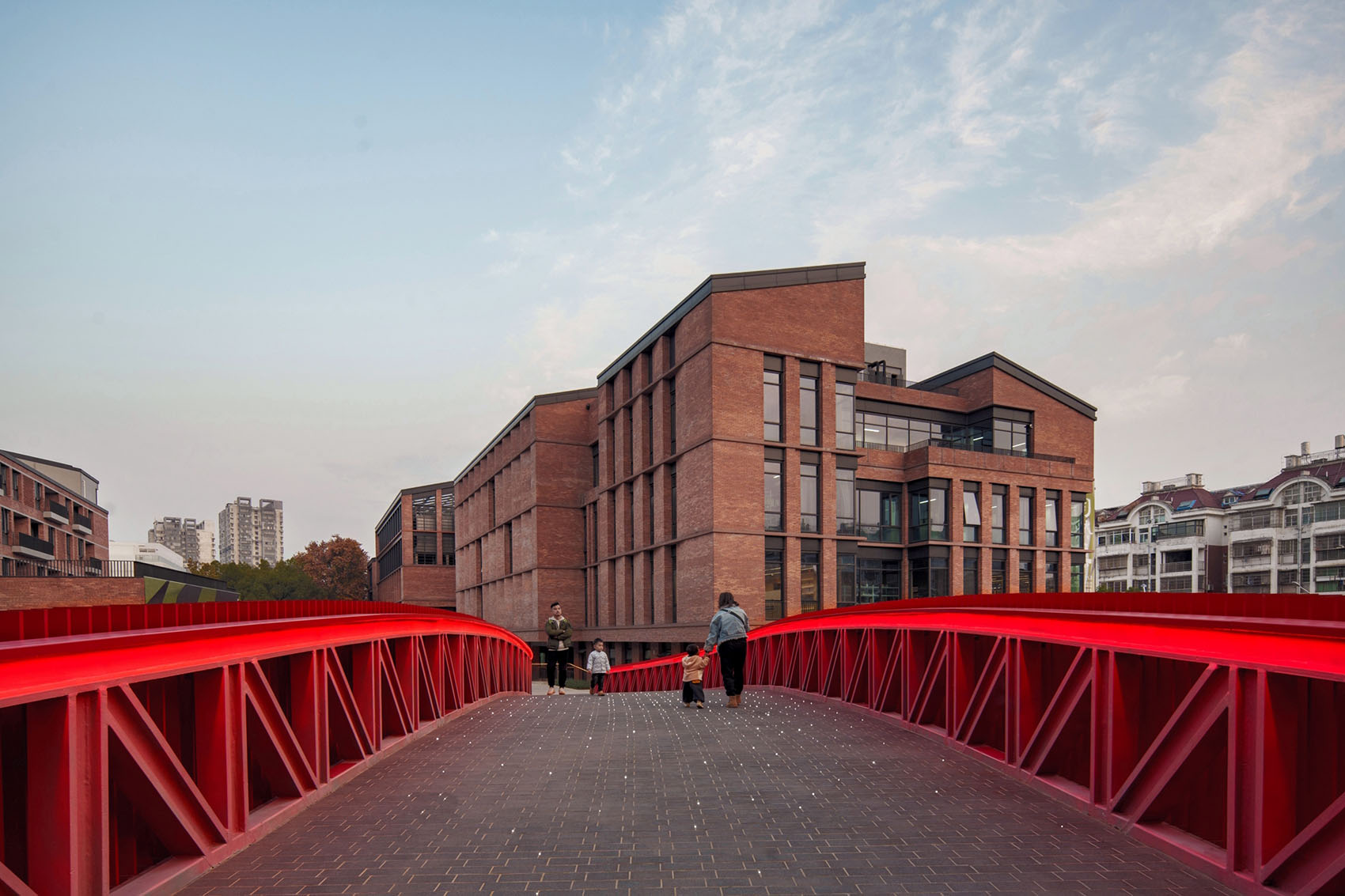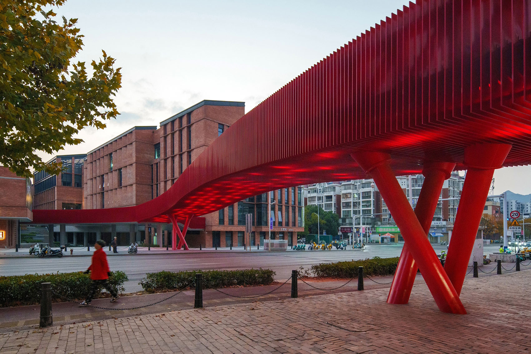 Taoxichuan Red Bridge is a landscape bridge designed for pedestrians and cyclists, spanning one of the major traffic arteries in the urban area of Jingdezhen City, the millennium-old porcelain capital. With a length of 53 meters and a height of 6.4 meters, it links Taoxichuan Creative Plaza on the west side to the entrepreneurial block renovated from Weimin Porcelain Factory on the east side, forming a 2-kilometer-long pedestrian walkway. The bridge introduces a new urban strategy for Jingdezhen—subtly repairing the rift created by traffic infrastructure while catalyzing a shift toward green mobility.
