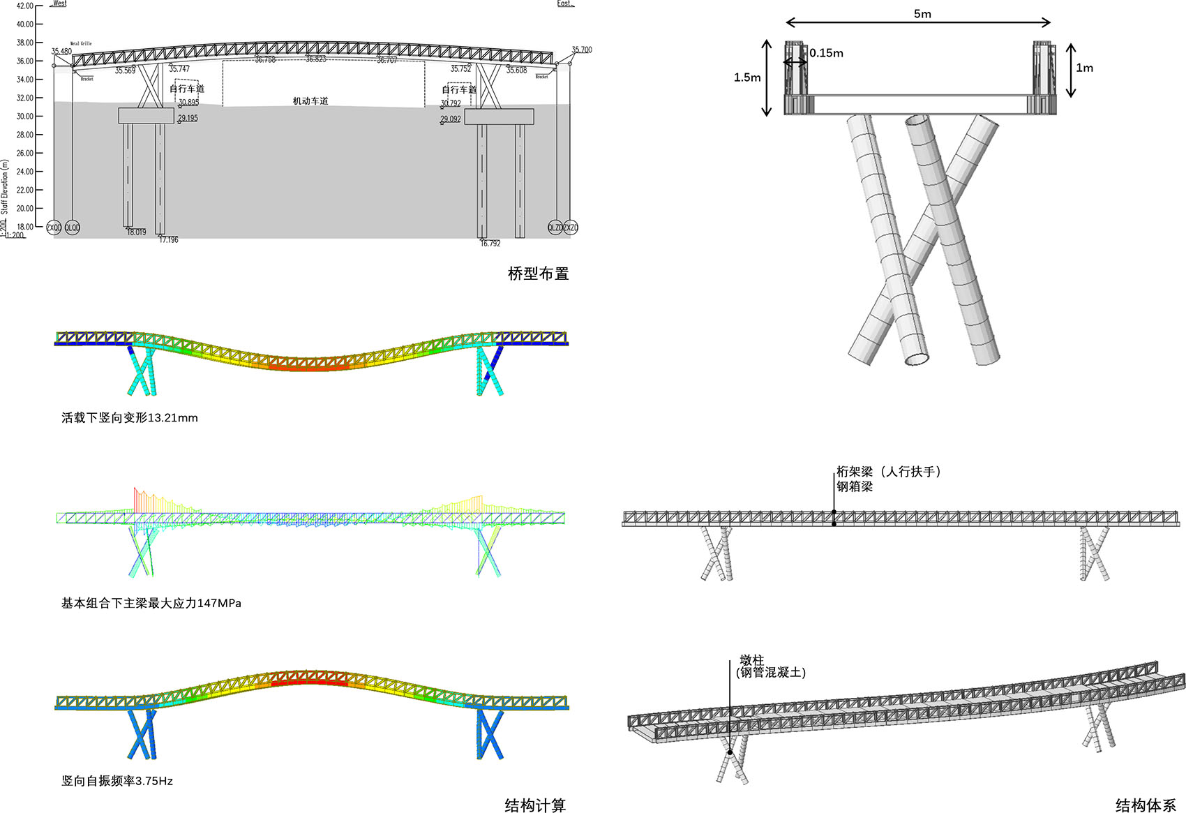 桥身采用整体式钢桁-钢箱梁组合结构,钢材受拉、混凝土受压,充分发挥两种材料的力学性能,实现1+1>2的效果。主跨36m,主梁高0.4m,高跨比1/90,属国际目前同类跨度梁高最小的景观桥。主梁兼做桁架下弦杆,实现构件受力效率最大化。采用装配式施工理念,施工过程快、不影响下部交通。