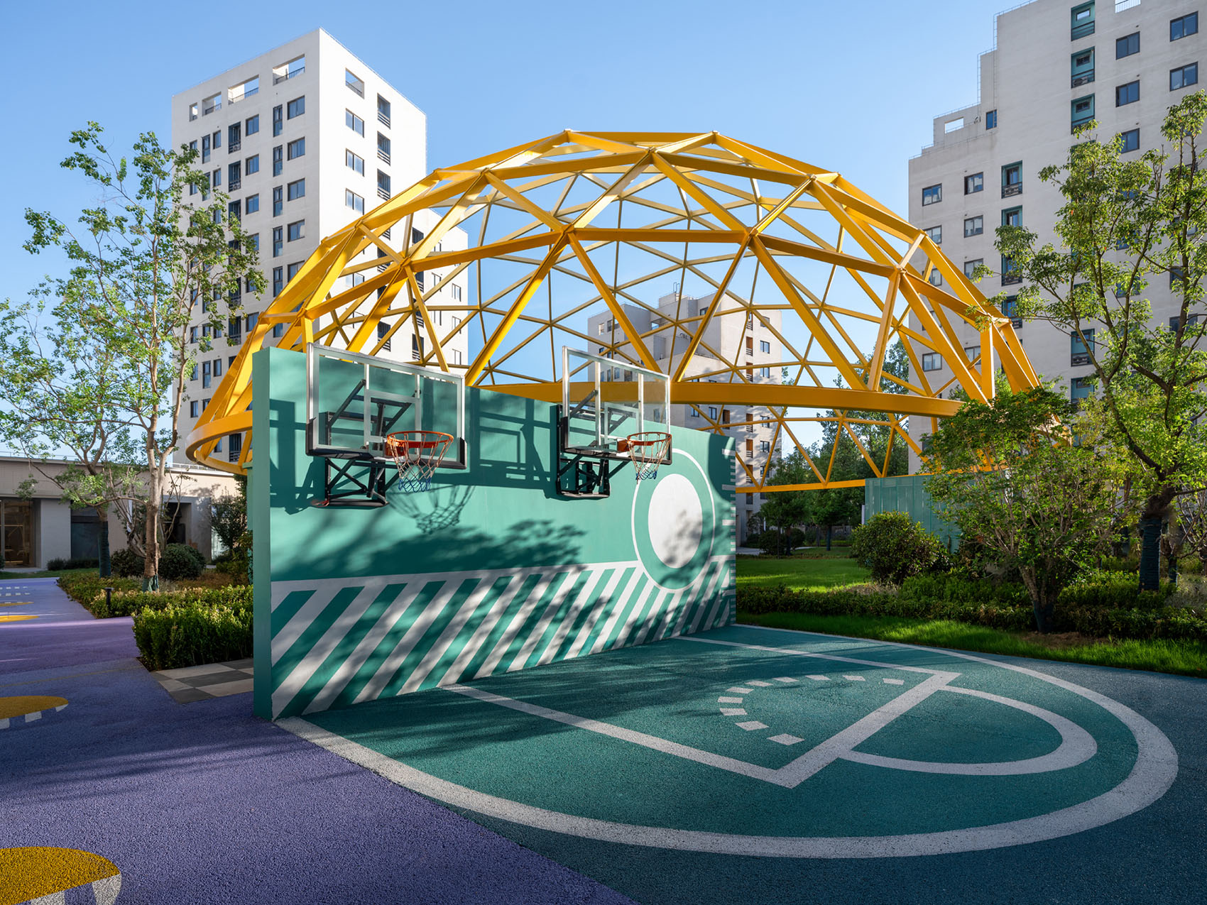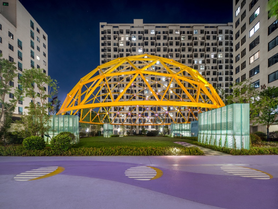 Referencing China’s lunar calendar and the moon as a primary measure of time, the Supermoon is a 26-meter self-supporting geodesic dome resting on four ventilation structures. Inside, each node becomes a point of light, forming a contained celestial field within the city. Residents gather beneath the dome into the evening, extending daytime use into a nighttime activity. In traditional culture, moongazing is a social activity often associated with drinking in the garden; the design supports this function with an outdoor bar.