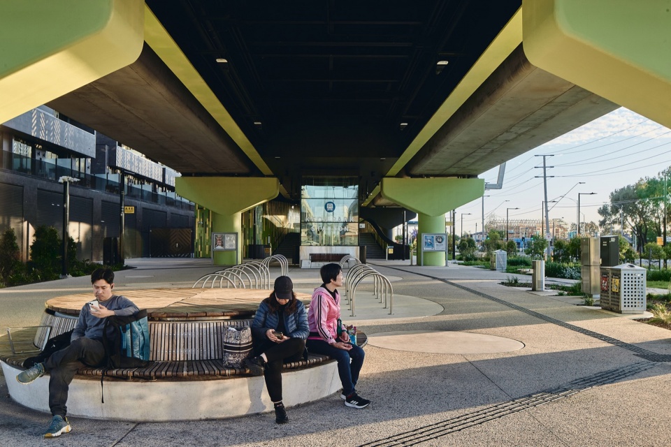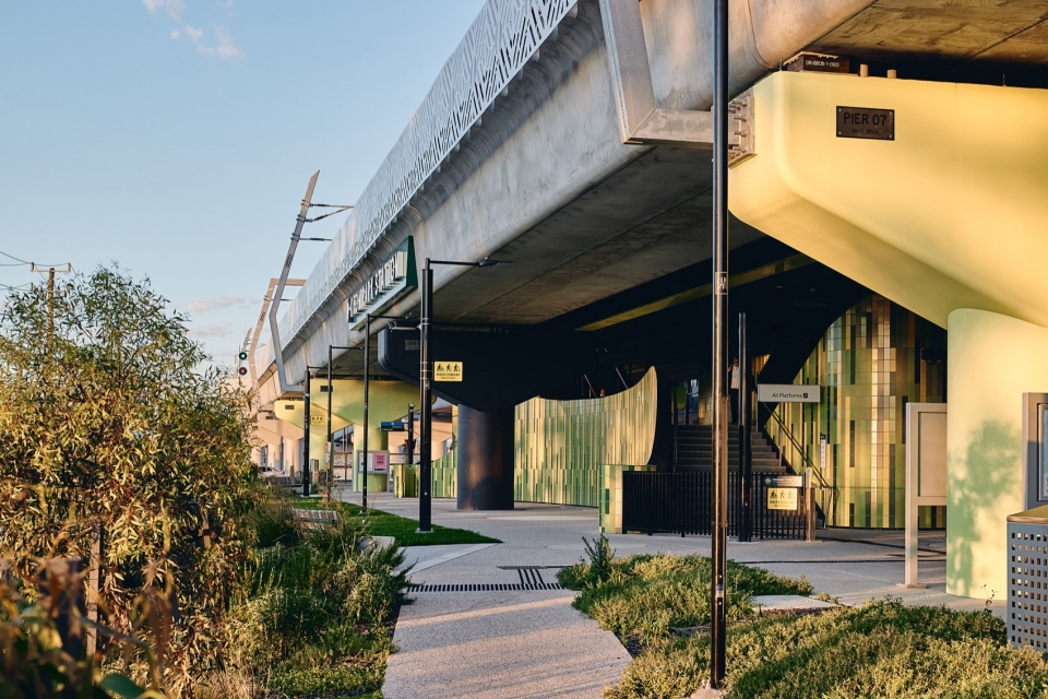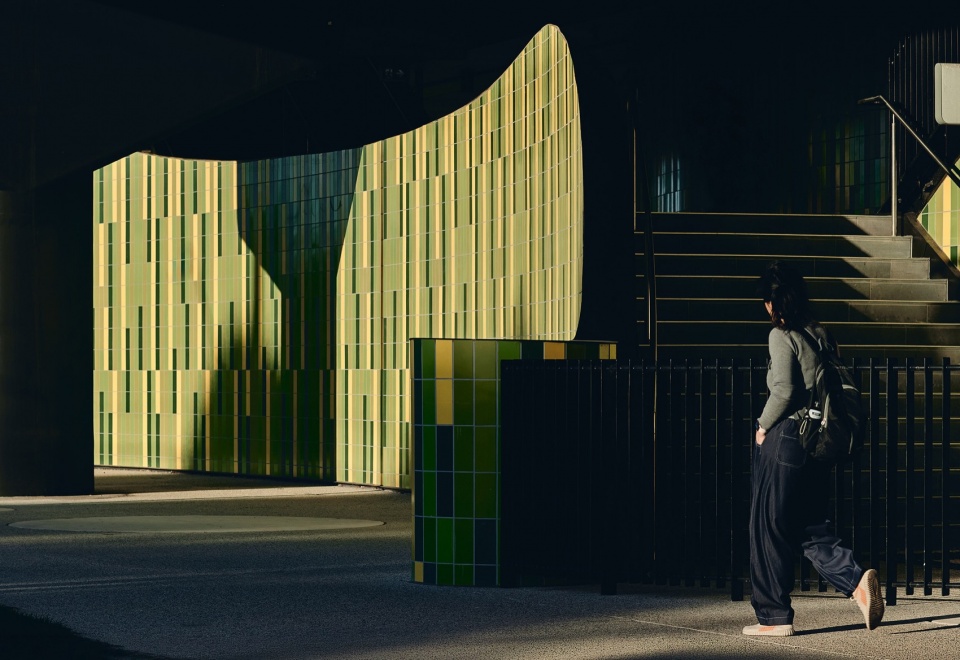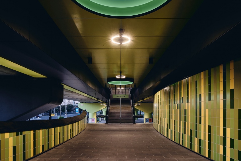 The station is underpinned by a clear and legible conceptual framework that translates the character of the surrounding parklands into built form. In anticipation of newly planted landscapes maturing over time, the architecture establishes an immediate sense of place through a “virtual landscape.” A robust ceramic tiling system in light green, dark green and yellow wraps key public elements, animating the station and softening the scale of the concrete viaduct. This carefully calibrated use of colour delivers both identity and wayfinding, allowing the station to read as a distinctive civic marker within a challenging context defined by a multi-lane arterial road and adjacent industrial development.