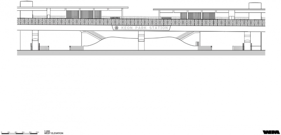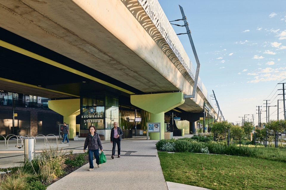 Keon Park 车站作为墨尔本 Mernda 线上的一处当代公共门户,位于中央商务区东北约14公里处,服务于 Thomastown 区,并处于 Whittlesea 市与 Darebin 市的交界处。该项目由 North Western Program Alliance(NWPA)实施,作为 Keon Parade 平交道口移除工程的一部分,由 VIDA Rail 作为业主。新车站以高架轨道与站厅取代了原有受限的地面车站,消除了 Keon Parade 上危险的平交道口,并将原本割裂的交通廊道转化为更加安全、连通的公共基础设施。