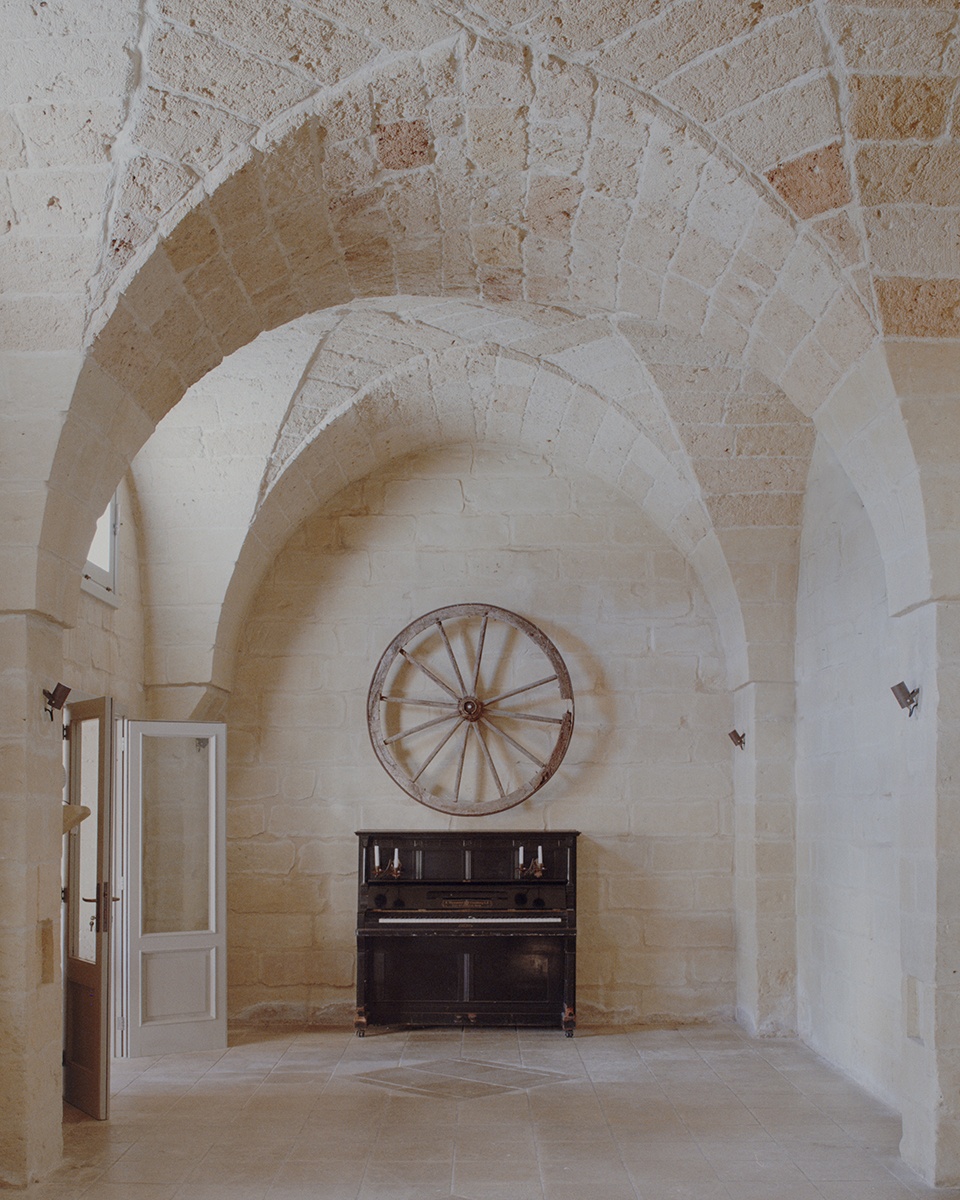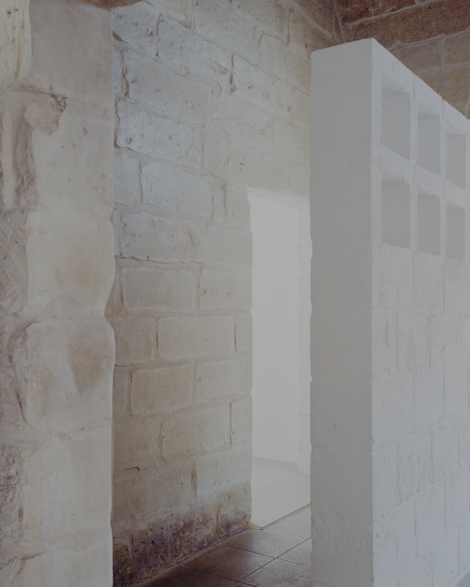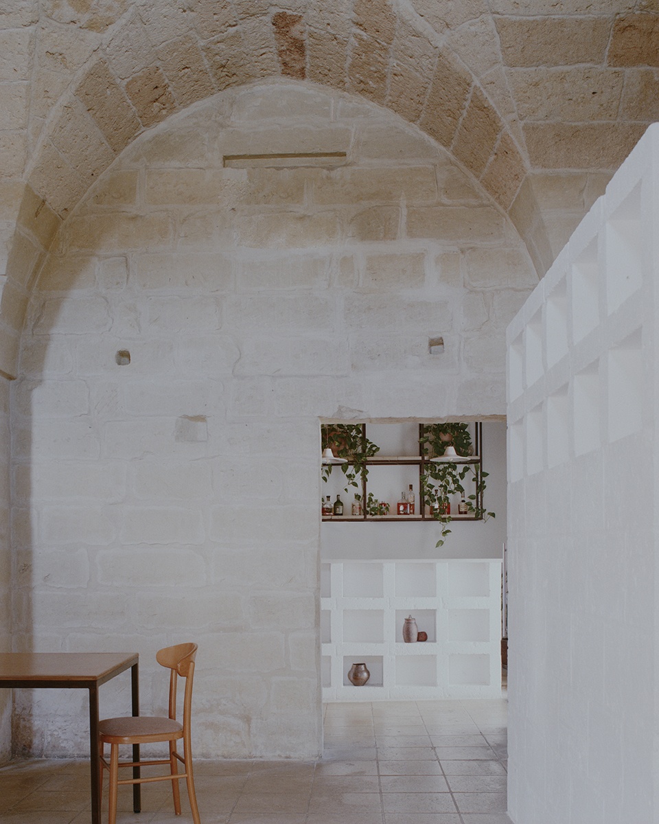 Before the intervention, the structure presented numerous discrepancies and inconsistencies, dictated by numerous additions carried out without a conservative approach. Margine’s work thus appears to be an architecture of subtraction: removing the false coverings, eliminating the inconsistent finishes, camouflaging the antithetical structures. In restoring the pure and warm image of the Lecce stone building, the repurposing of the spaces occurred through three simple, targeted, essential, and informative interventions: a bench, a fireplace, and a partition. All three elements were constructed of tuff stone and whitewashed with limewash to highlight the contemporary intervention compared to the original structure.