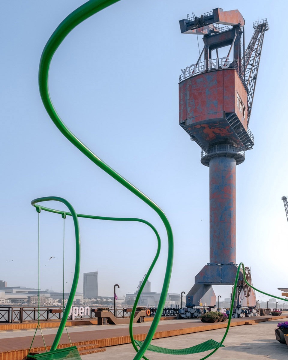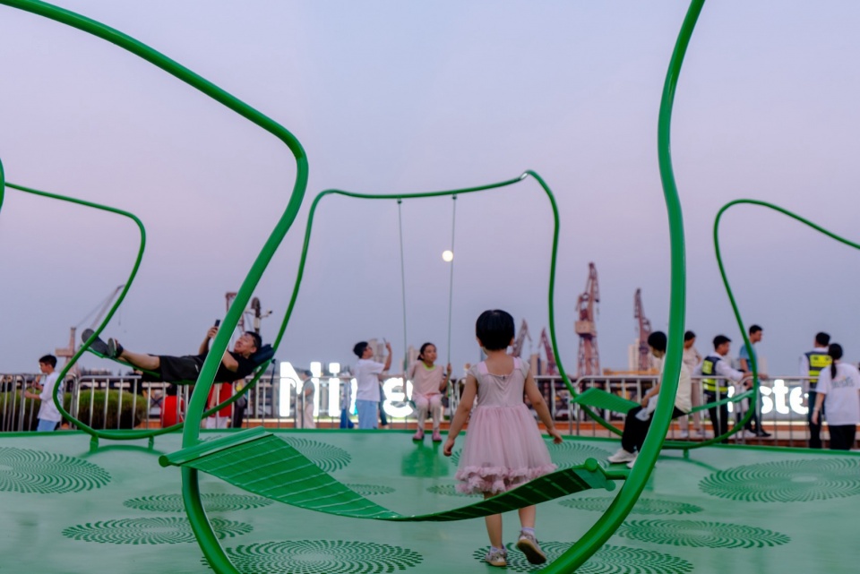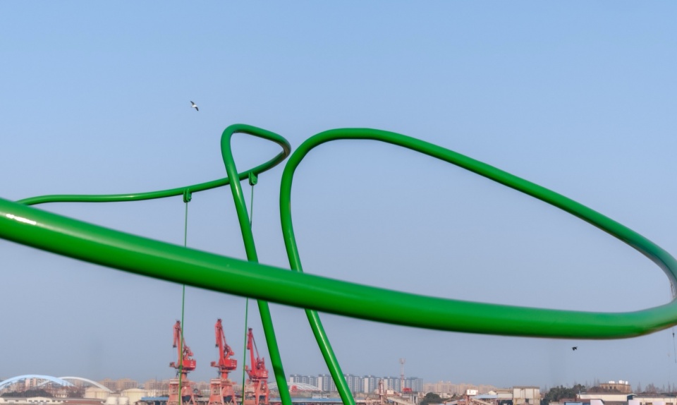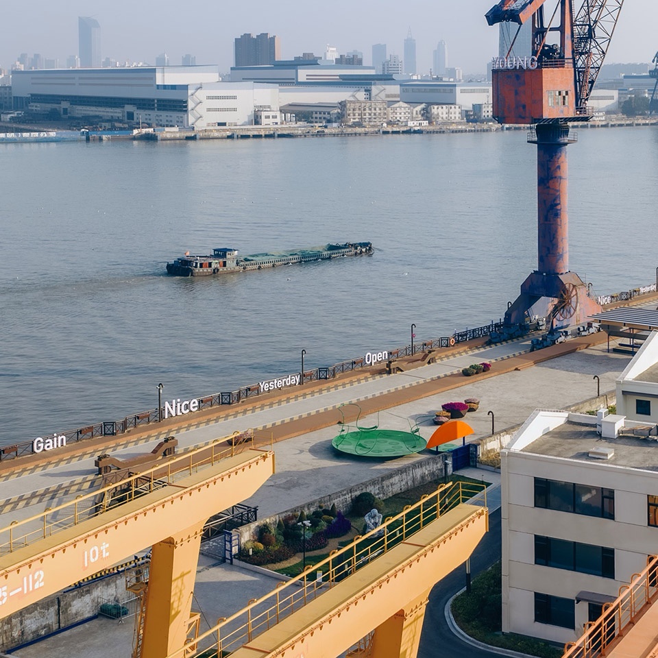 Shanghai Shipyard Riverside Park was formerly the site of the Zhonghua Shipbuilding Factory. While Shanghai changes with each passing day, this place has remained largely unchanged.As a result, the factory buildings, huge tower cranes and tracks together create a strong industrial atmosphere in this area. The clamor of shipbuilding in days gone by still seems to echo, with machines clanging and clattering ceaselessly. This time, we have transported the playground equipment from the street parks of our childhood memories into such a setting. Incorporating the imagery of ceaselessly running machinery and the radiant sun as natural symbols, this installation employs concave metal discs and semicircular orange-red lamps to convey an intuitively perceptible resonance.