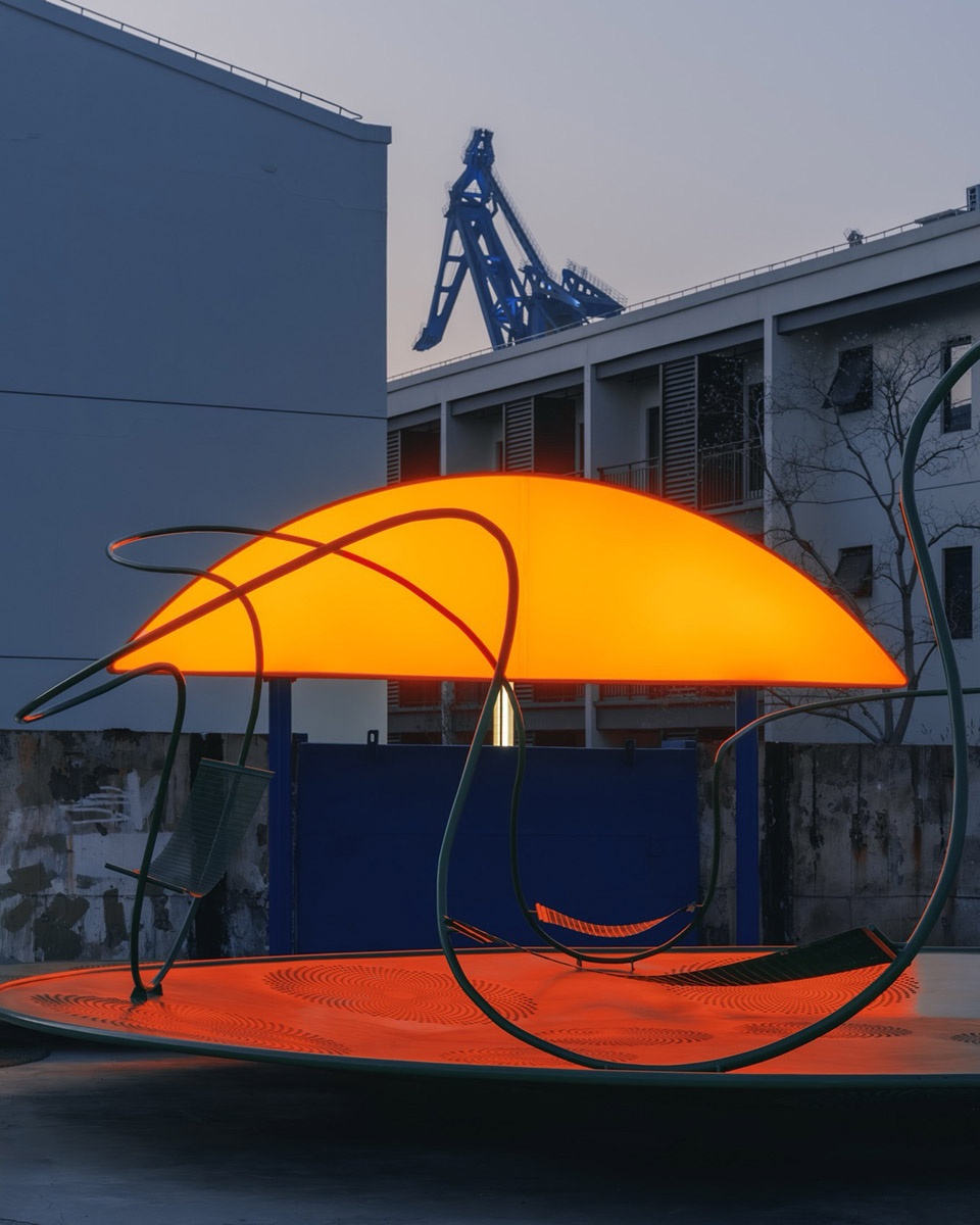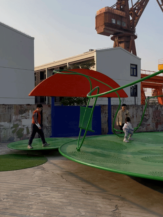 船台公园前身为中华造船厂,城市斗转星移,而这里似乎并未发生太多变化,因此,厂房、巨大塔吊、轨道便将一种浓厚的工业氛围锚定进具体场域。昔日的造船声响犹在耳畔,机器叮咚不停歇。这一次,童年记忆里街头公园的游乐设施被我们搬运至这样的场景之中,融合持续运转的机器与辐射能量的太阳两种符号意象,用内凹形的金属圆盘与半圆形橙红灯具,向外传递着可被直观感知的共鸣。