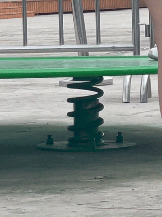 The core interactive platform of the installation is circular. Using the straightforward formal language of a perfect circle links the installation to the natural symbol of the “sun”. The two discs vary in size and height and are both supported by a ring of springs along the edge of their base. Above the base of the installation, the overhanging and radiating curved railings are transformed from fitness horizontal bars. Metal woven protective mesh and swings are interspersed among the railings in a scattered arrangement. At this point, the “machine” is fully assembled.