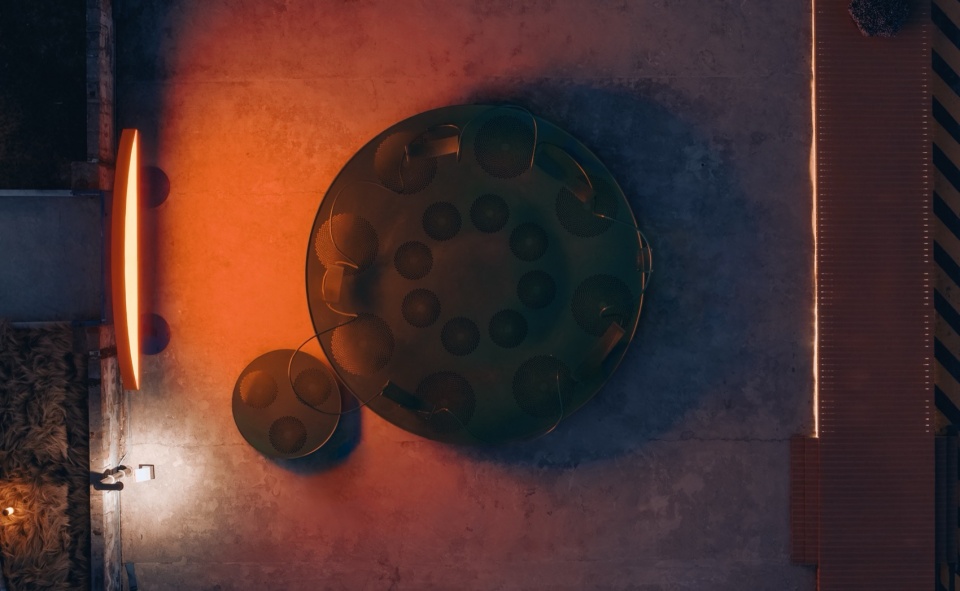夜幕降临,圆盘近旁的灯光散发出深红色光晕,笼罩着绿色机器及其周围空间,幽幽红光如落日似朝霞,持续散发着某种原始吸引力,用超自然空间氛围吸引游人本能地靠近。