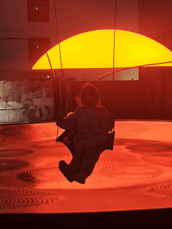 The machine is imbued with elasticity throughout, swaying with the bouncing crowd. As night falls, the lights near the discs emit a deep crimson glow that envelops the green machine and the space around it. The red light is like the setting sun or the morning glow, exuding a primal allure. It draws visitors instinctively closer, creating a supernatural spatial atmosphere.