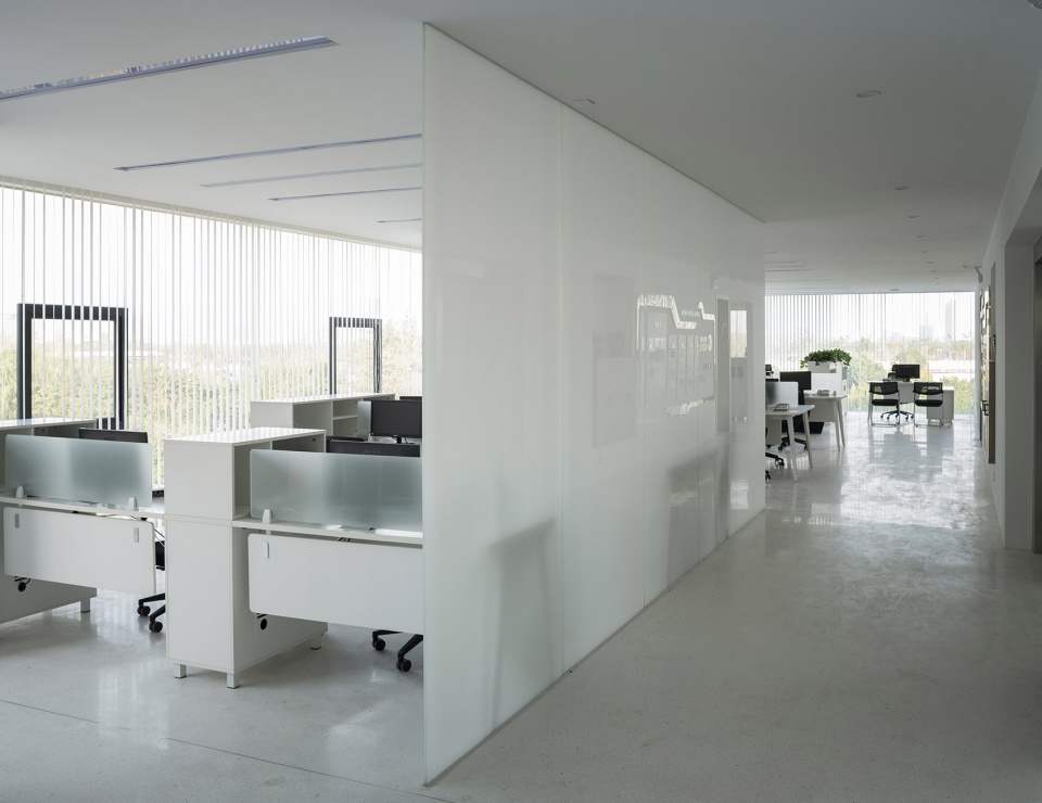For able to introduce invisible light into the layers in a visible form, we used green glass as the armrest in the corridor where the function box is connected to the virtual body (atrium). Green is the brand color of the client. At different time of the day, the light can extend this color to different positions in the room. The use of large areas of white color on the floor and wall significantly highlights this effect.