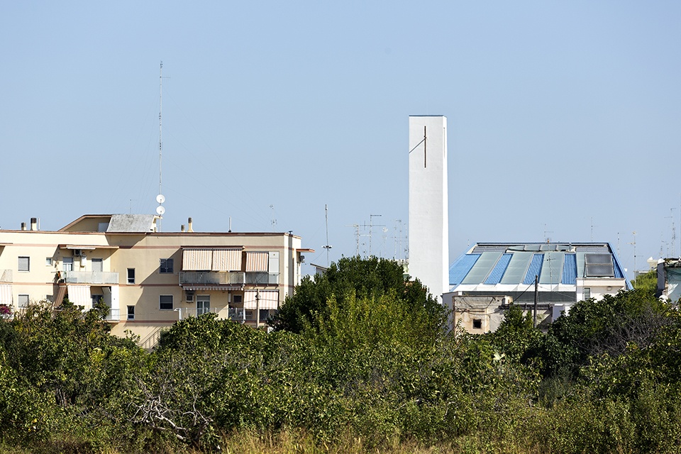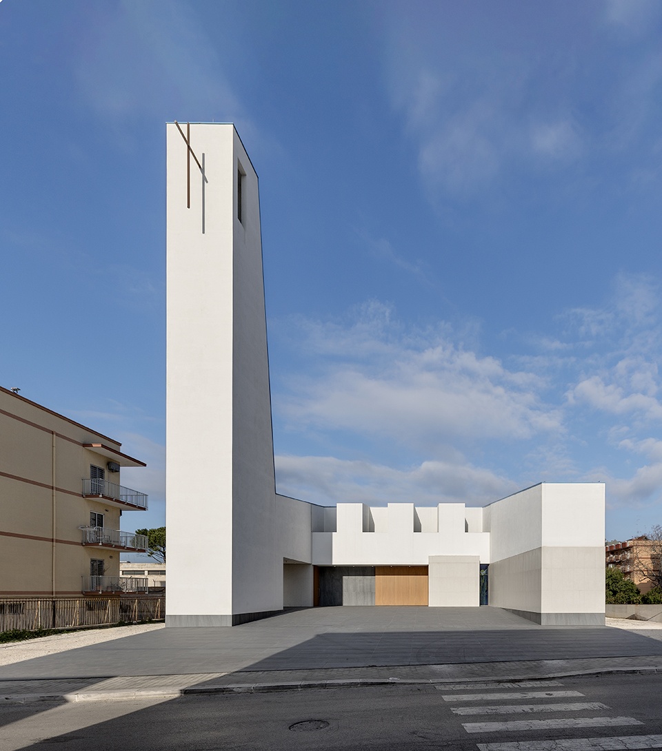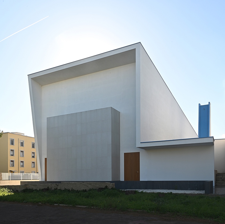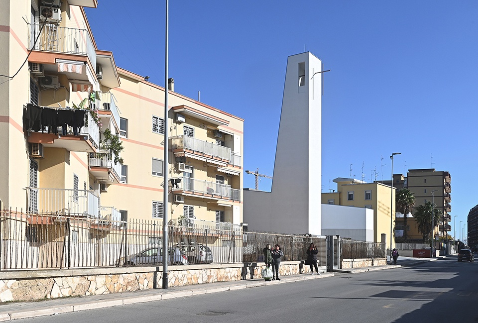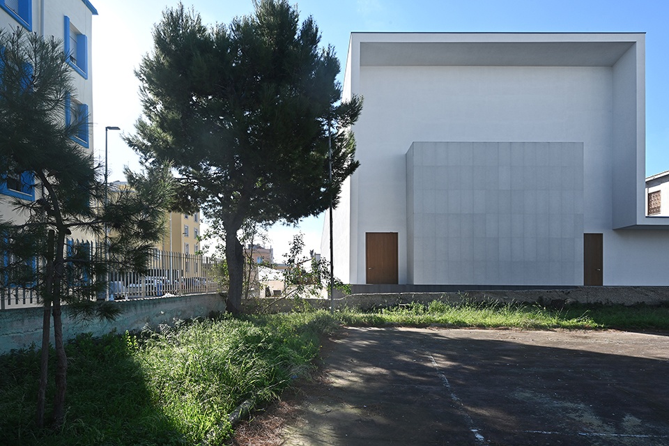 The exterior arrangements concern the residual space of the desired building of the maximum possible extent to accommodate the entire community of a difficult suburban neighborhood of the city. The wide churchyard, slightly rising toward the elevation of the church, realizes a small square recessed between the street, the bell tower, the extrados volume of the baptistery and the front of the entrances.