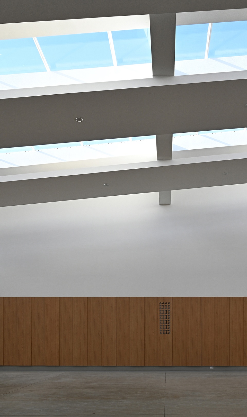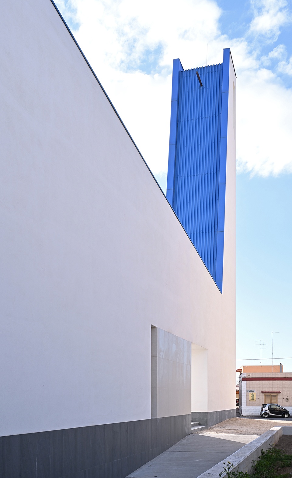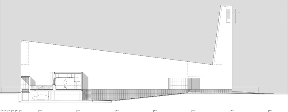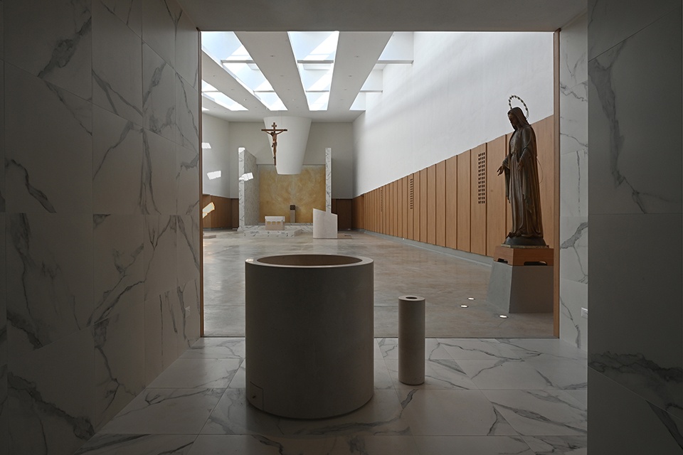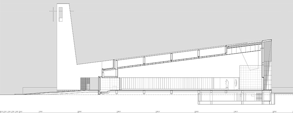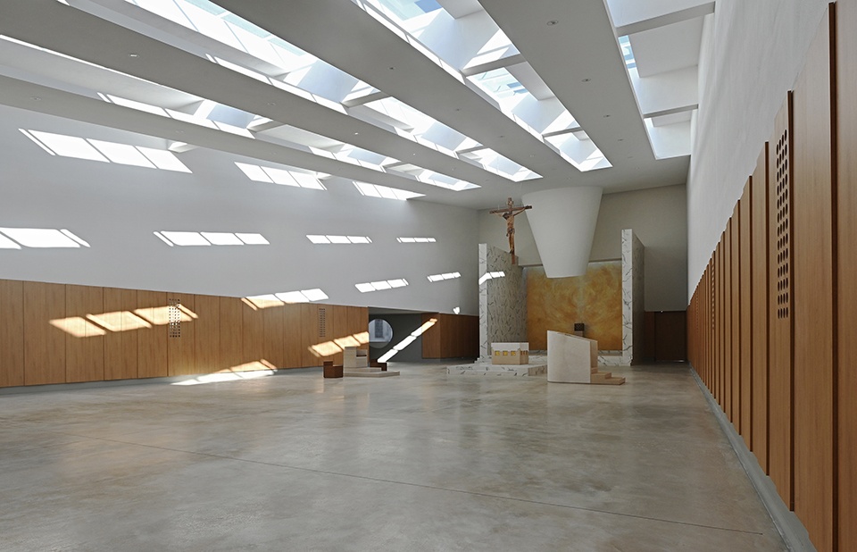 In the liturgical space, light is provided by skylights that define the outline of the volume of the church, low and wide at the entrance, high and narrow toward the back: a perspective machine that accentuates the longitudinal dimensions of the building and recalls the presence of a ‘higher order.’