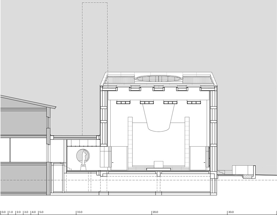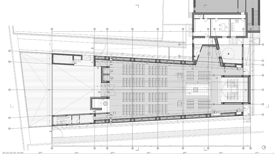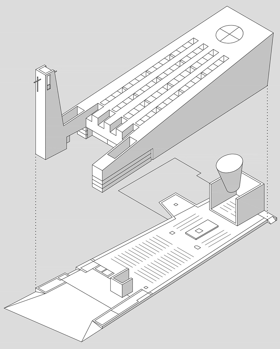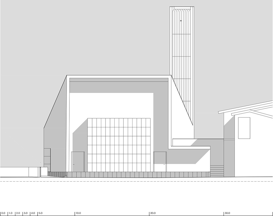 教区建筑群的两部分由两主体间狭小的梯形空间相连,高差则通过设于圣徒礼拜堂体量内的室内楼梯得以消解。新建楼梯连通既有圣器室,该圣器室仍为新教堂履行原有功能,同时衔接将被改造为牧灵活动大厅的旧教堂。牧师办公室与教区档案库房仍保留在既有建筑内。