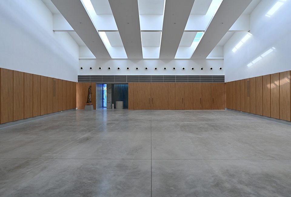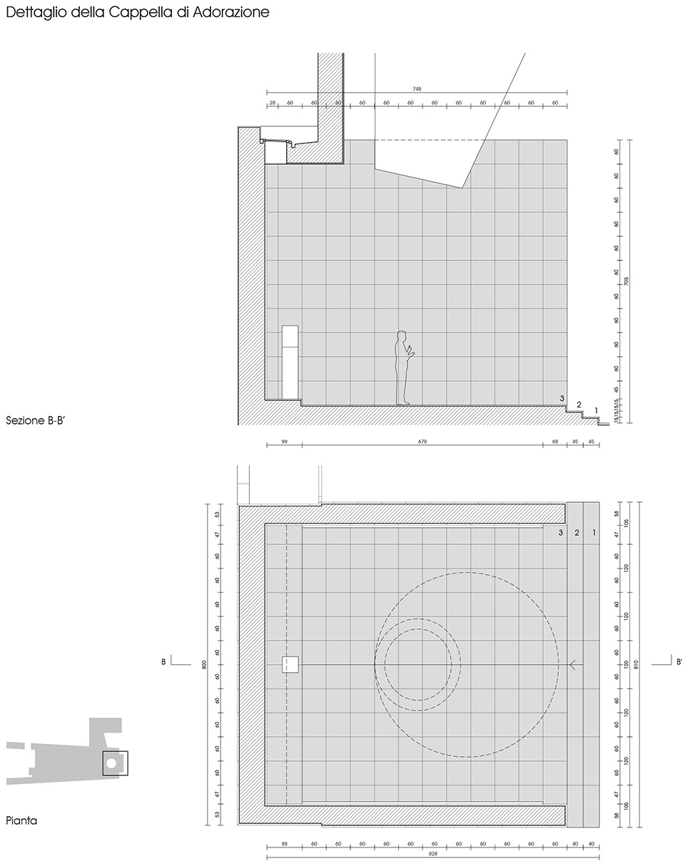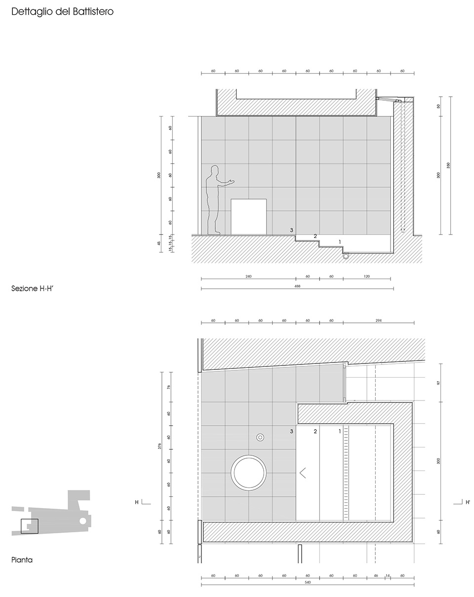 The two parts of the parish complex are connected by the small narrow trapezoidal volume between the two bodies whose differences in elevation are overcome by the internal staircase placed in the volume of the Chapel of the Saint. The new staircase accesses the existing Sacristy that continues to fulfill its function in favor of the new church and connects the existing church intended to become a hall for pastoral activities. The pastor’s office and the parish archives also remain in the existing building.