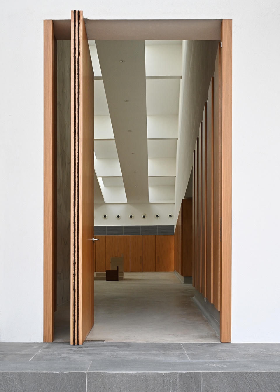 在礼拜空间内,采光由天窗提供,天窗勾勒出教堂的形体轮廓:入口处低矮宽阔,向后逐渐高耸收窄。这一透视设计强化了建筑的纵向尺度,亦象征着“更高秩序”的存在。