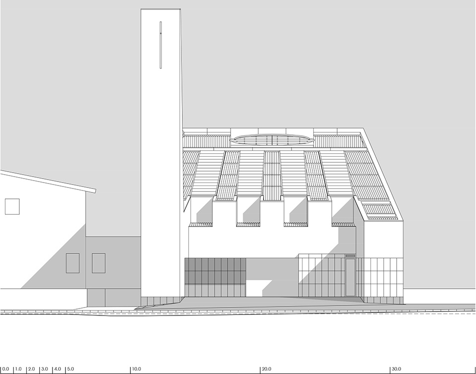 新建建筑所在地块为教区自有、与圣杰罗姆街垂直相交的一片土地。礼拜大厅的具体形态由可用场地的几何条件决定。