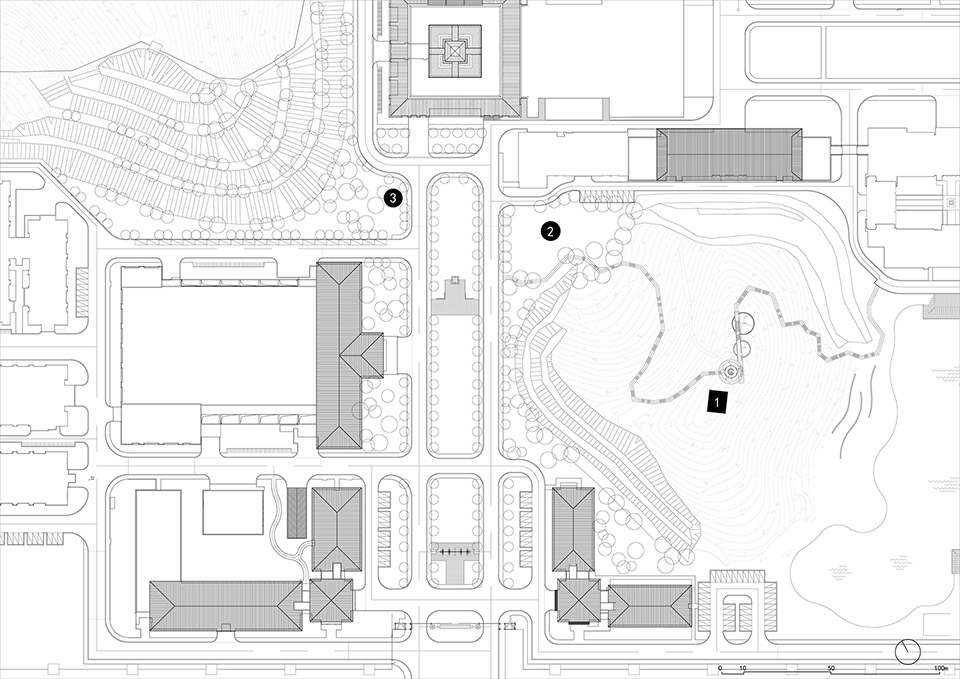 方案完成深化设计后,学院第二次提出更换选址,二易其址的消息一度让我们感到沮丧,但经过对新场地的现场踏勘和分析,我们发现最终的场址呈现出意料之外的妙处:这里一侧面向校园人文轴线,是处于图书馆与教学区之间的重要节点;另一侧则背靠自然山体坡地,林木葱郁,氛围幽静。场地呈现出的“双面性”使其成为连接人文与自然、路径与目的地的交汇点。它既坐落在师生的日常动线上,又提供了转向自然、短暂抽离的契机——亭子在此自然成为连接两种校园体验的枢纽。