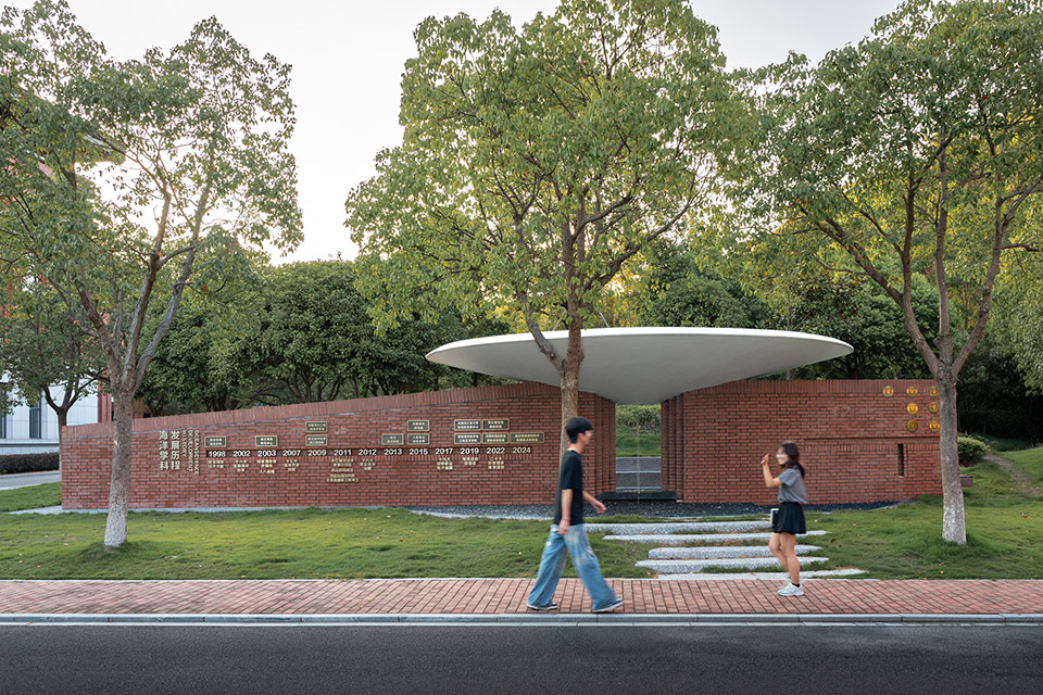 在浙江大学舟山校区办学将满十周年、海洋学科迎来第十五个春秋之际,作为舟山校区的设计团队,我们受邀为校园设计一件纪念物。最初的任务明确而典型:一座雕塑。但我们思考,在这样一片与海为邻、清远宁静的校园里,纪念是否有更生动的形式?相比树立一个孤立的视觉焦点,不如创造一个能容纳体验、激发互动的场所。这一想法得到了学院的信任与支持。于是命题从“一座雕塑”被解放为“一处场所”——“亭”的概念自然浮现。它意味着庇护、停留与聚集,既能容纳象征性的精神核心,也能围绕它展开日常的休憩、交流与沉思。