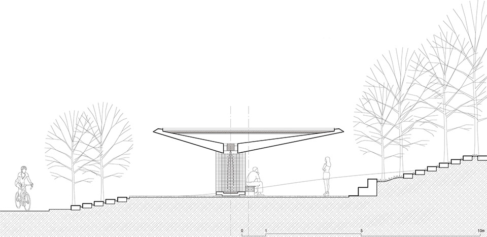 基于场地的双重属性,我们进一步强化了亭子的“双面”表达:Based on this duality, we intensified the pavilion’s “two-sided” expression: