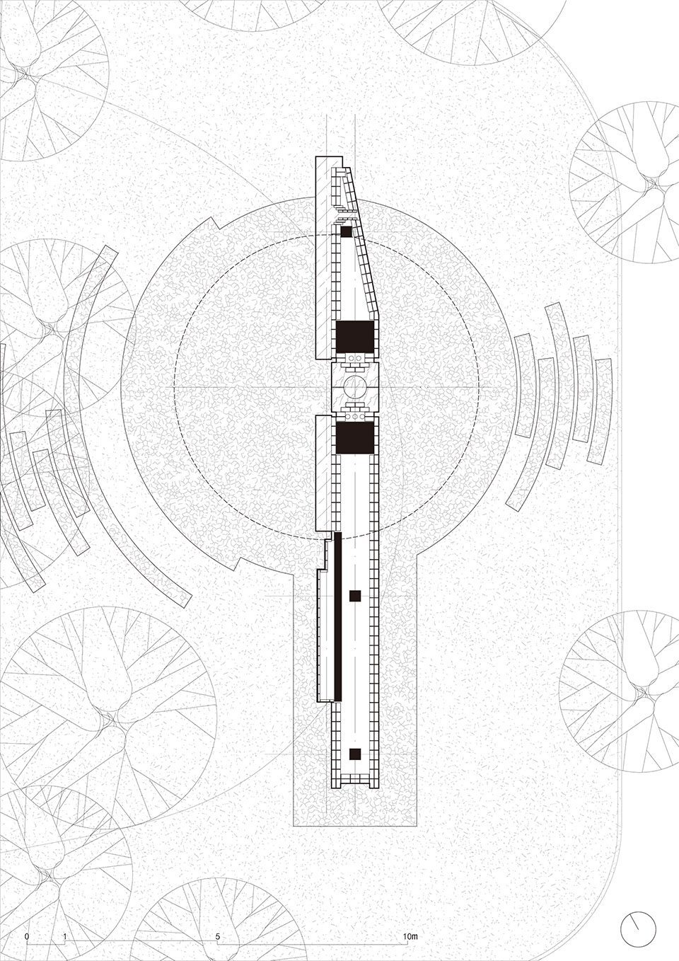 一道清水砖墙将圆形水盘托起,形成清晰的空间界定。朝向校园人文轴线的一侧,墙体成为展示十五年院史的长卷,墙端圆形水盘中央,水流持续滑落,形成一道轻柔水幕。这一侧是外向的、精神的,是面向集体的文化呈现。朝向自然山体的一侧,我们采用了截然不同的策略:通过一条穿过树林的缓径移步接近,被刻意压低的水盘使亭子从隐到显缓缓呈现;水盘倒映天光云影;亭内地面与座位嵌入微微隆起的坡地,与绿景相融,模糊了构筑物与自然的界限。这一侧是内向的、静谧的,是关于停驻与静思的邀请。这种“一分为二”的处理,并非割裂空间,而是基于场地文脉的精准回应,使亭子同时承载纪念性与日常性的两种表情。