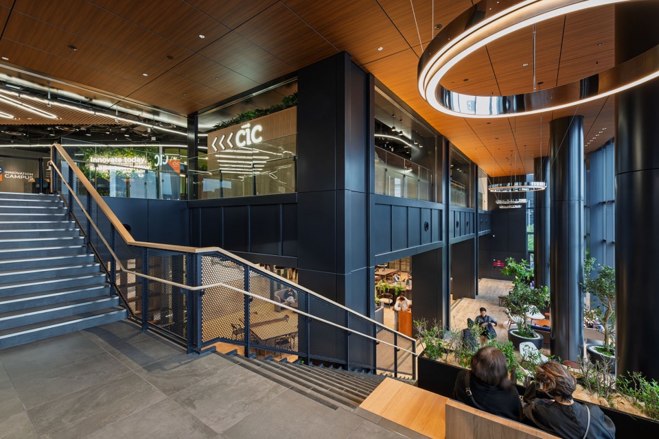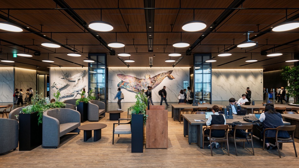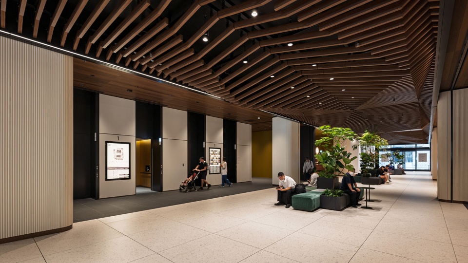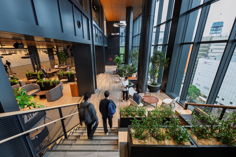 街区开发目标提出了“创造交汇点”这一概念,致力于在内部打造融合多元功能、供市民和来访者往来穿行的“城市公共空间”。通过在高密度开发中融入丰富的公共空间,使建筑成为城市的一部分,打造出向城市开放的建筑。具体规划包括:开放街区街角的广场、作为天神入口大厅的Grand Lobby、传承福冈大厦记忆的GRANDE AVENUE、向市民开放的食堂、能感受城市气息的酒店屋顶露台与中庭,并在商业层和办公层之间的中间楼层设置了连接创新基地、挑空2层的标志性空中大厅。空中大厅的设计初衷不仅仅是单纯的办公等候空间,更旨在打造一个任何人都可以利用的公共空间。