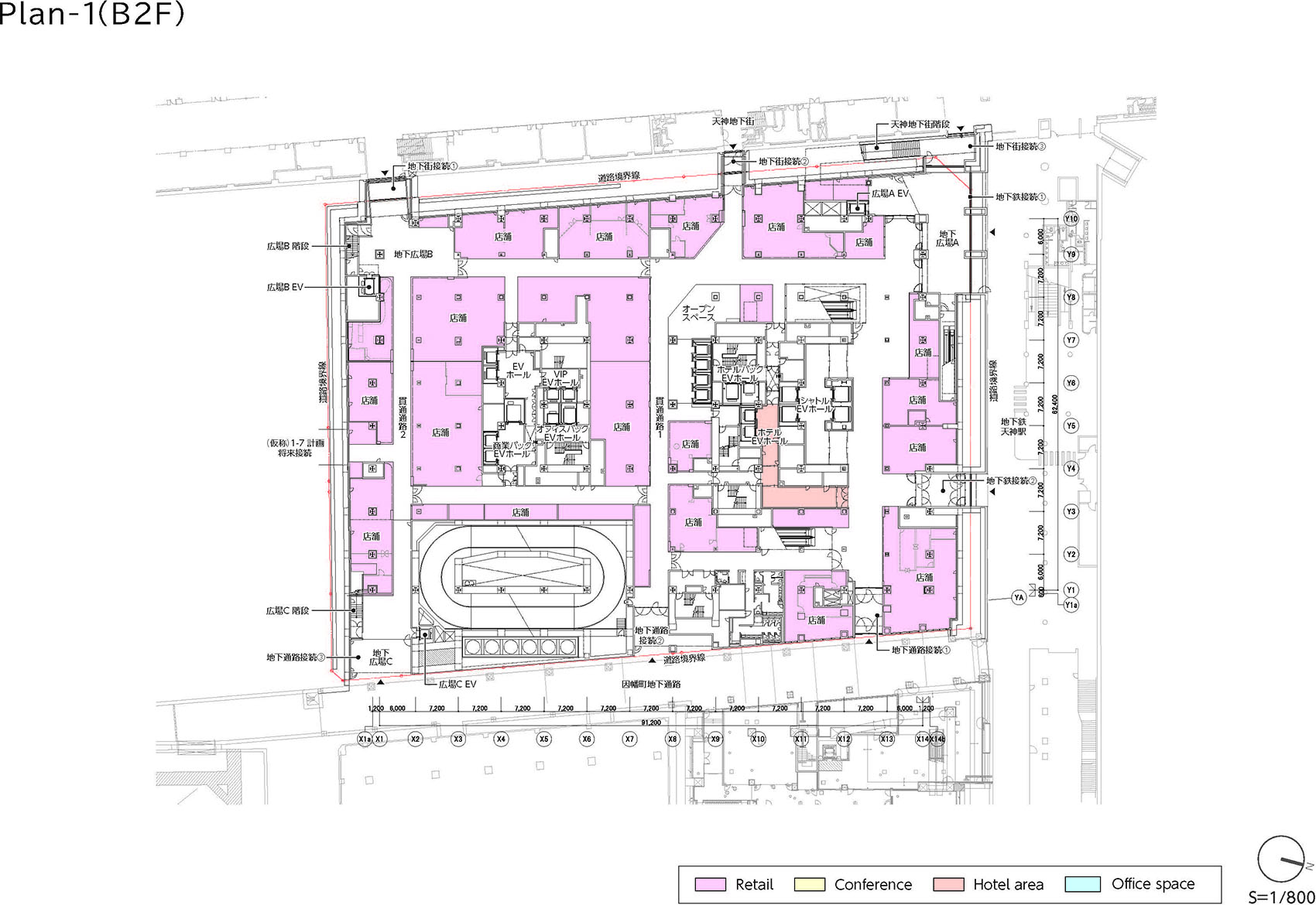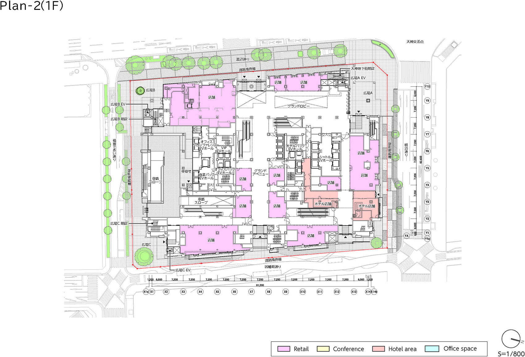 通过1层和地下2层与周边街区相连,形成人流无缝衔接的通行体系。在地下2层,北侧连接地铁天神站,西侧连接天神地下街,东侧连接因幡町大道地下通道,形成通过贯通通道将各个连接部位串联起来的动线体系。通过这些连接设计,提升了包括相邻街区在内的回游性,强化了天神地区的地下交通网。被道路四面环绕的1层,也通过面向各条道路设置多个入口,形成了可从街区穿行而过的布局。
