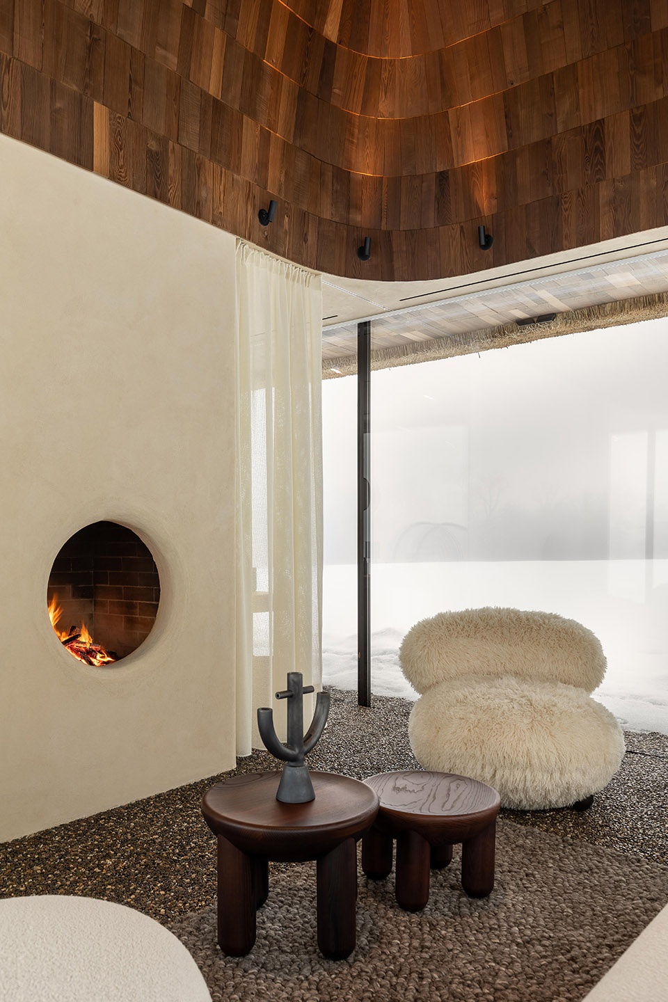 不设电视是一个刻意的选择。透过壁炉的圆形开口凝视跳动的火焰,并与周围的自然环境保持持续的视觉联系,这有助于实现信息戒断和情绪恢复。