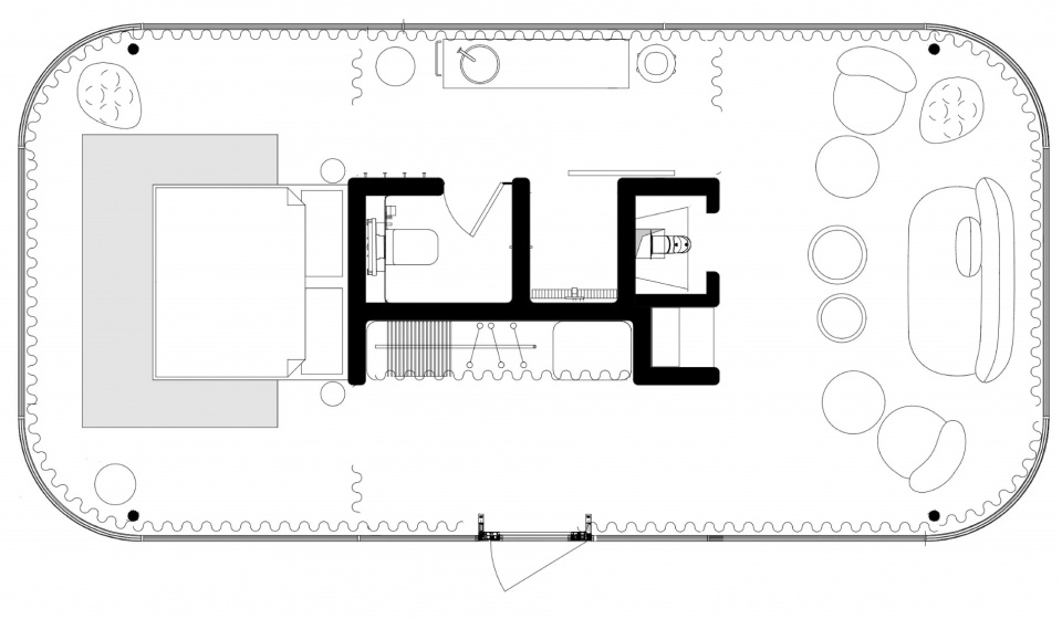 The uninterrupted glazing enhances the sense of immersion in nature, allowing the landscape to become an integral part of the emotional experience. When privacy is needed, guests can close dense yet visually light curtains, operated automatically via a control panel located by the bed.