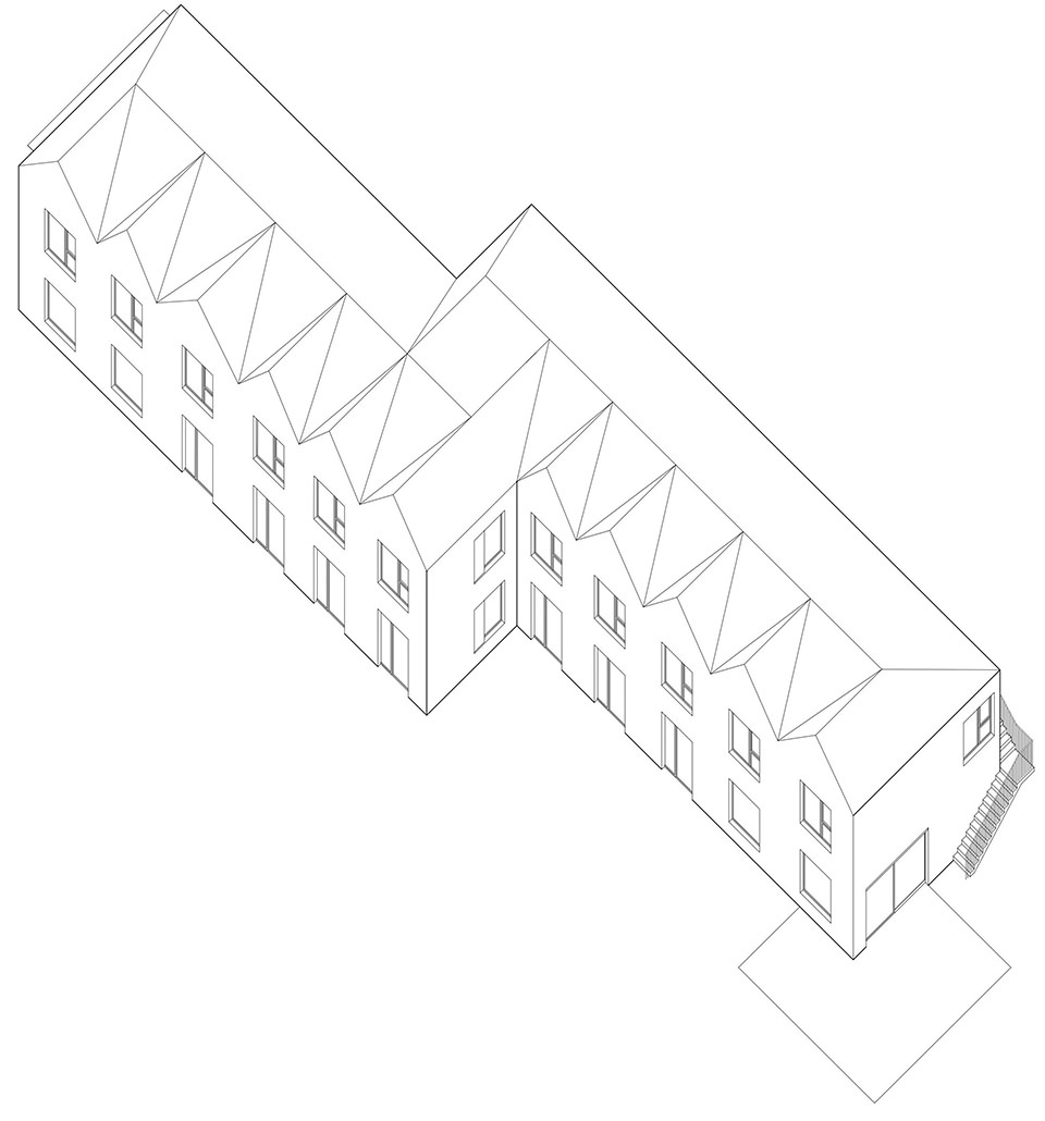 Towards the street, the building presents a unified front. At the rear, a rhythmic series of gabled roofs unfolds, each marking the scale of a private room. This repetition creates a layered reading of the building: a cluster of small houses gathered into one collective home.