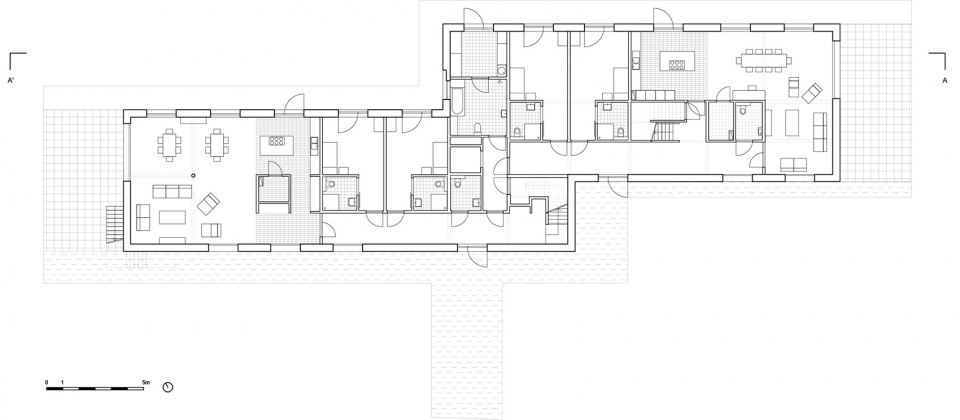 An existing villa forms the starting point for the transformation into a care home for people with mental health challenges. Stripped down to its bare structure, the house loses its roof and finishes, revealing the simple logic of parallel walls. This structure becomes the framework for a new plan, where a generous corridor connects a sequence of independent studios.