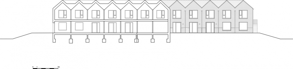 面向街道的一面,建筑呈现出统一的立面。而在背面,一系列呈节奏排列的三角墙屋顶徐徐展开,每一座都标识着一个私人房间的尺度。这种重复创造了对建筑的分层解读:如同一个个小房子聚集而成的一个集体之家。