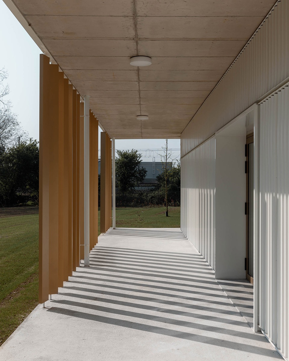 The perimeter portico is articulated by a sequence of vertical sun-shading slats that function as both a visual and climatic filter. As one moves through them, these elements produce a rhythmic fragmentation of the perception of the landscape, transforming vision into a dynamic experience. For children, this results in a near-sequential perception of the external environment, which is continuously recomposed through movement and observation.