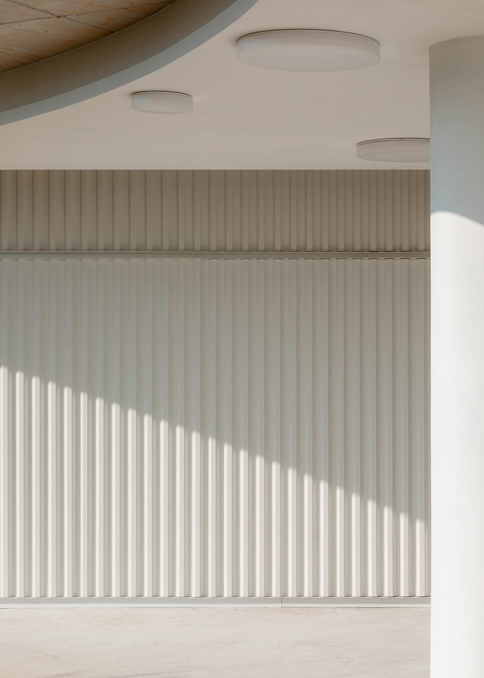 这种建筑与景观之间的连续性,通过环绕建筑的连续周边柱廊进一步强化。柱廊沿各立面展开,界定出一个可停留、可使用且具有保护性的过渡界面。除强化整体建筑形象外,它还在环境层面发挥重要作用,通过调节自然光与气候条件提升舒适性。对于儿童而言,柱廊构成一种中介空间——一个内外相互渗透的过渡装置,在提供安全感的同时,营造出有利于自由游戏、社会交往与探索的环境。