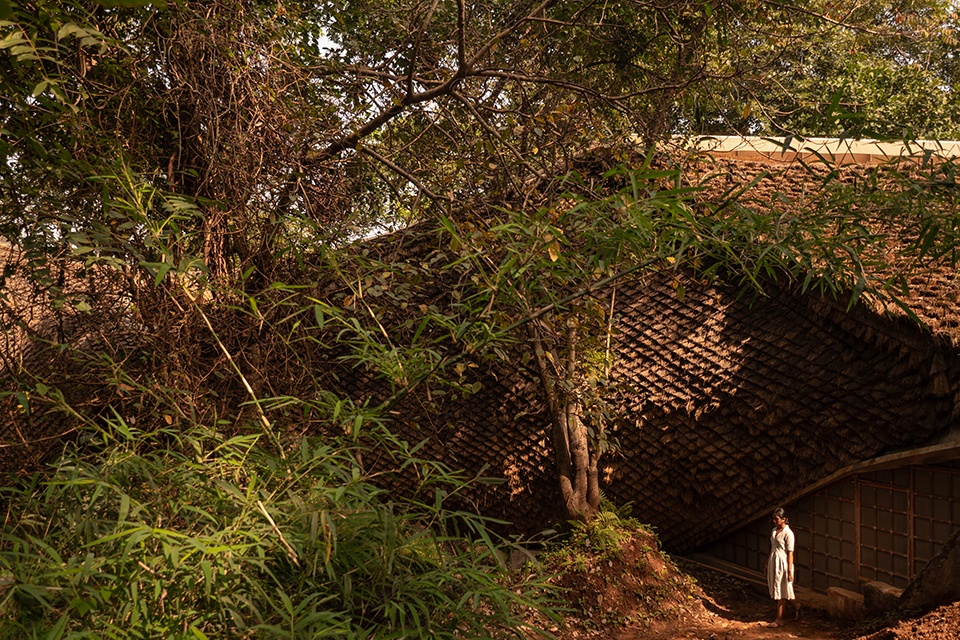 Inset between the numerous trees in the gorge, the bridge floats like a giant cocoon, camouflaging itself easily into the dense foliage. The thatch layer inspired by the scales of a pangolin, providing thermal insulation and effective cooling also allowed us to push for a long-span, lightweight structure with just 4 footings, ensuring very less intrusion into the natural contour of the land. The mud plaster layer ensures that rodents or pests don’t burrow their way inside the dwelling (the prime reason for thatch roofs falling out of favour ) and added compressive strength to further stabilize the structure in the absence of a vertical suspension pillar. The structure becomes a living ecosystem – where humans dwell undisturbed on the inside and nature finds its place outside.