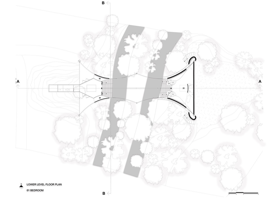 该地块位于卡尔贾特,背倚群山,TATA泄洪道溪流从中穿行而过,在土地中央切出一道深达7米的峡谷。项目伊始便面临着重重制约:两块土地必须连接起来,但地基不得落在泄洪道100英尺宽的范围内;我们可以建造一座可供居住的桥梁,但桥下必须有足够的净空,以便挖掘机清理下方的两条溪流;我们想用当地材料建造这座桥,但方圆五英里内,野生草似乎是唯一的材料。桥之家的构想便诞生于这些限制之中:”一座100英尺长的悬索桥,由四个双曲抛物面构成,采用最少的钢管和筋腱提供抗拉强度,并以茅草-泥土复合材料提供抗压强度。”