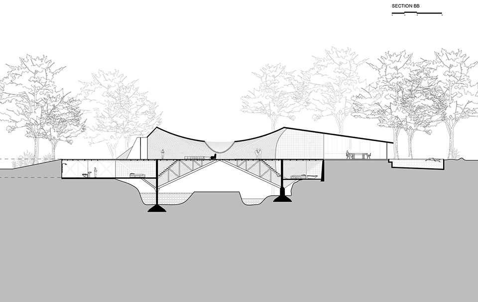 桥之家悬于峡谷的无数树木之间,如巨型蚕茧般漂浮,轻而易举地隐匿于茂密的枝叶之中。茅草层灵感源自穿山甲的鳞片,既能提供隔热与有效降温,也使我们能够采用仅四个地基的长跨度轻质结构,从而确保对土地自然轮廓的干扰降至最低。泥灰层则可防止啮齿动物或害虫在居所内掘洞(这也是茅草屋顶逐渐失宠的主要原因),并在没有垂直悬索柱的情况下增加了抗压强度,进一步稳固了结构。整座建筑成为一个鲜活的生态系统——人类在内不受打扰地居住,自然在外安得其位。