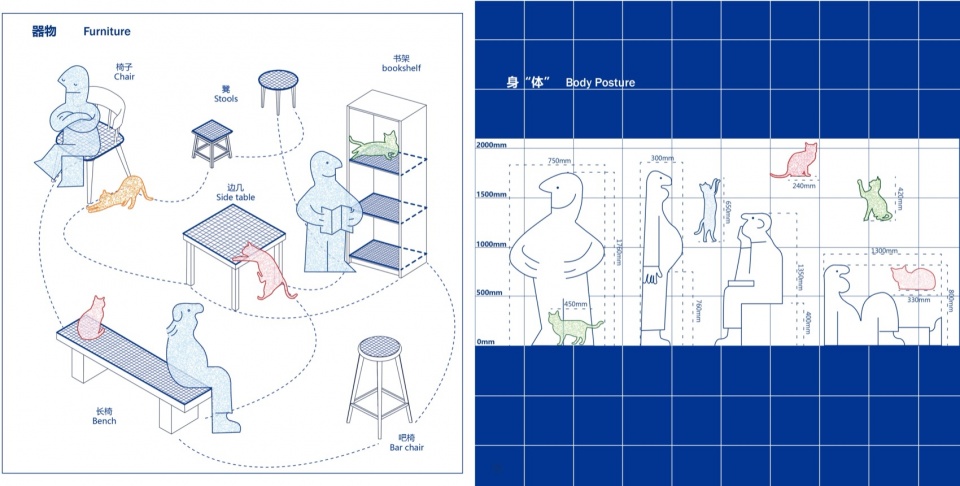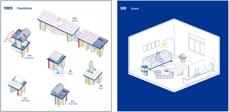 设计从日常家居物的尺度出发,将凳、椅、桌、架简化分解为使用界面、结构支撑以及剩余的空腔。当使用者选择骨架时,设计才真正开始:使用需求决定了“骨架”的形态,而人宠之间的相处模式、喜好与环境最终导向了设计的完成。“骨架”的初始设置被最大程度简化,使其呈现网格化与标准化,具备极强的扩展性与附着性。