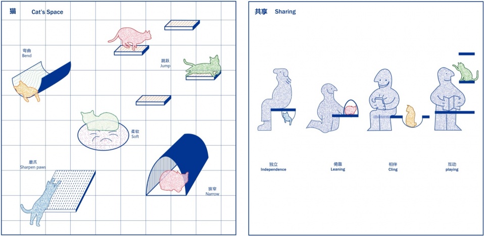装置以趣味性的形式与严谨的尺度逻辑,重构了猫与人共用的连接体与共享物。在寻求统一的共享界面与简化生活设施原型的过程中,传递出一种可持续的设计关怀。