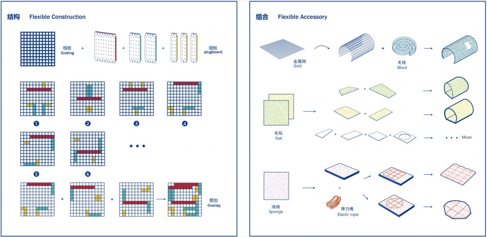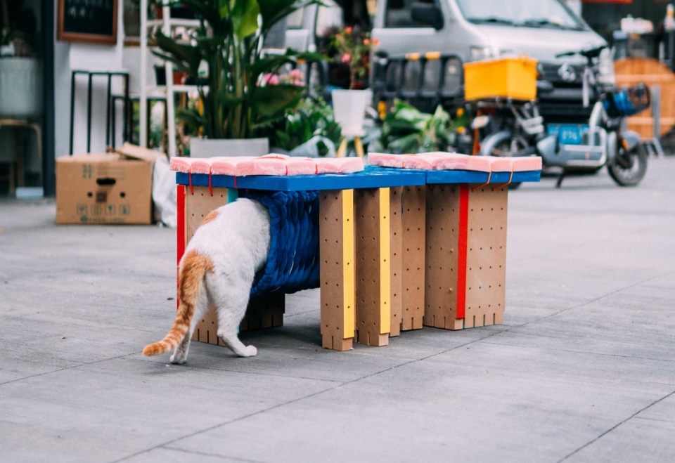 骨架的标准化与材料的多样性,也拓展了“转接头”在公共空间延伸的潜力。在紧张的城市空间中,社区灰空间是人们公共活动的聚集之所,然而人群散去后,这些空间也是流浪动物的驻足地。通过模数和材料的扩展,生长成城市尺度的社区家具,