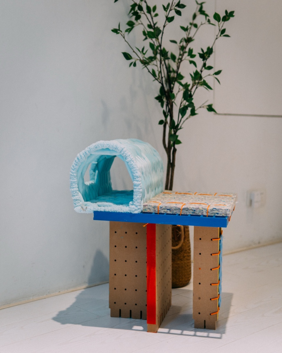 Contemporary pet furniture often arrives as “finished products” of industrialization, whose monotonous materials and mechanical language frequently become “leftovers” in limited living environments. By extracting a basic “Skeleton” and utilizing flexible components, objects are transformed into shared artifacts through active user participation. This skeleton acts as a set of predefined game rules, guiding participants to build functional volumes, while the “Skin”—be it cardboard, old clothes, hemp rope, or yarn—is left to the creative discretion of both humans and pets. As a “semi-finished” entity, the unit gains the potential for metabolic growth and continuous adaptation within the home.