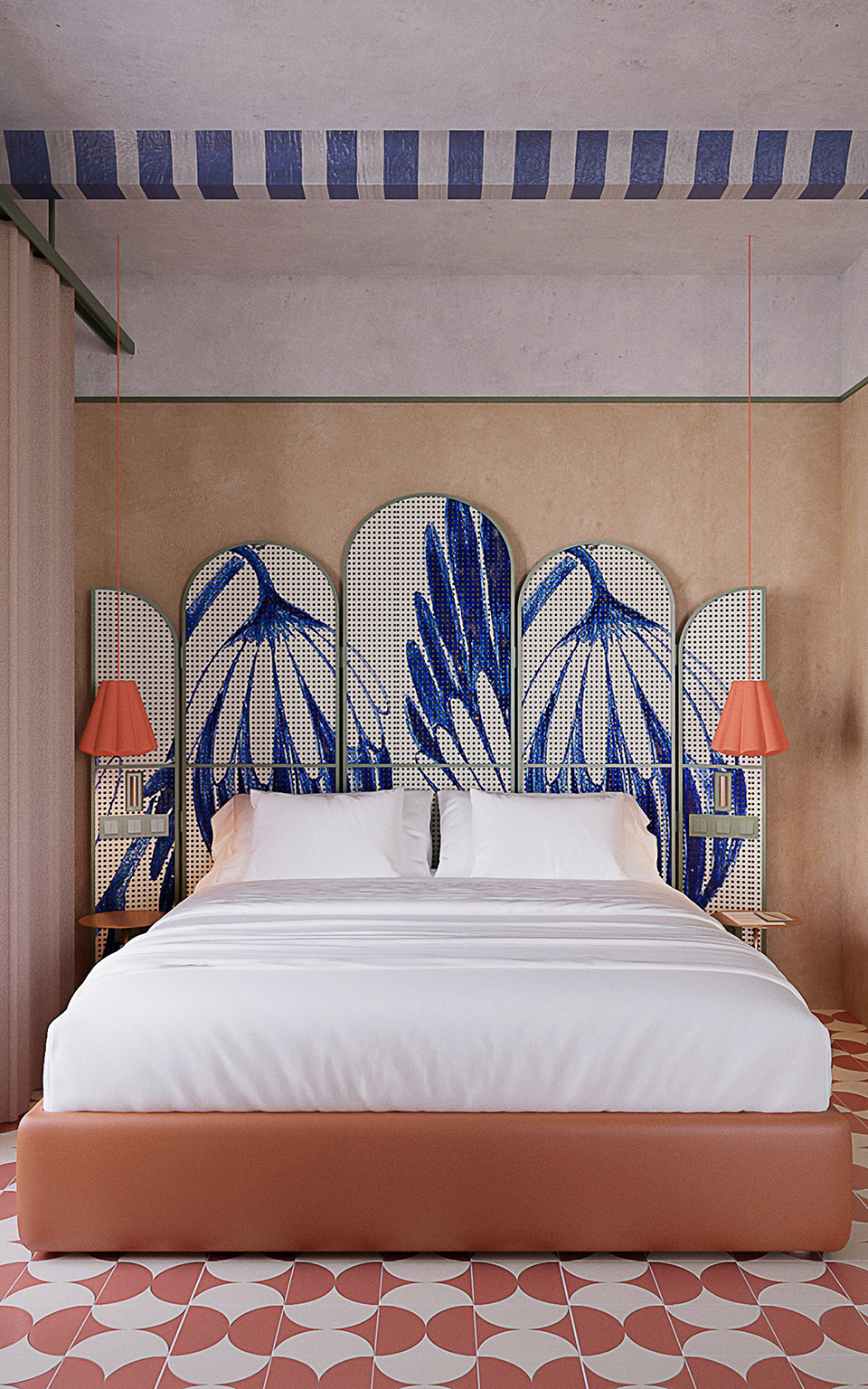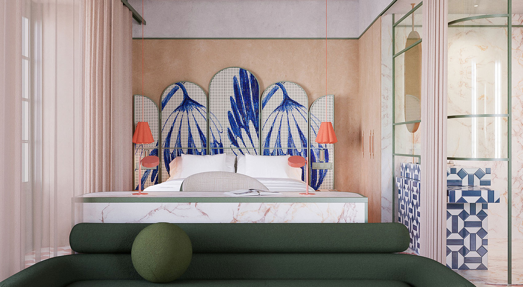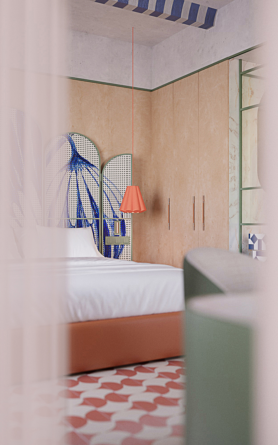 The interior design concept for these apartments, Casa Capirote, is deeply inspired by the essence of Seville, particularly Triana pottery, which is referenced in numerous details of the Plaza de España. This pottery, renowned for its vibrant colors and artistic details, is reflected in the design through decorative elements and geometric patterns present in the bed headboard, beams and sink, bringing a handcrafted and authentic touch to the space.