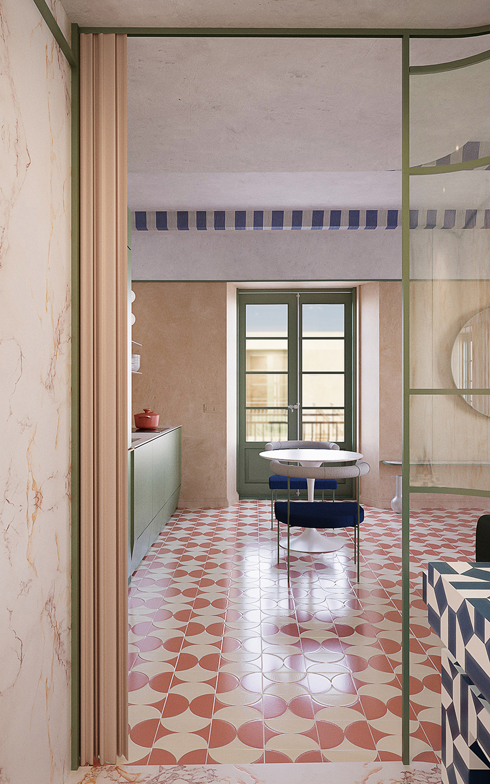 该公寓被塑造为一个独特、通透且多功能的空间,通过对窗帘的策略性运用来适应不同需求。窗帘使空间能够根据需要被分隔与重组,在更具社交性的环境与更私密或独立的区域之间实现灵活转换。这一设计策略不仅提供了高度的灵活性,同时也最大化了自然光的引入,营造出温暖而明亮的空间氛围,并凸显出城市所特有的土色与绿色调。自然光强化了空间的开阔感与与外部环境的联系,使整体氛围更加宜人,并与周边环境保持和谐。