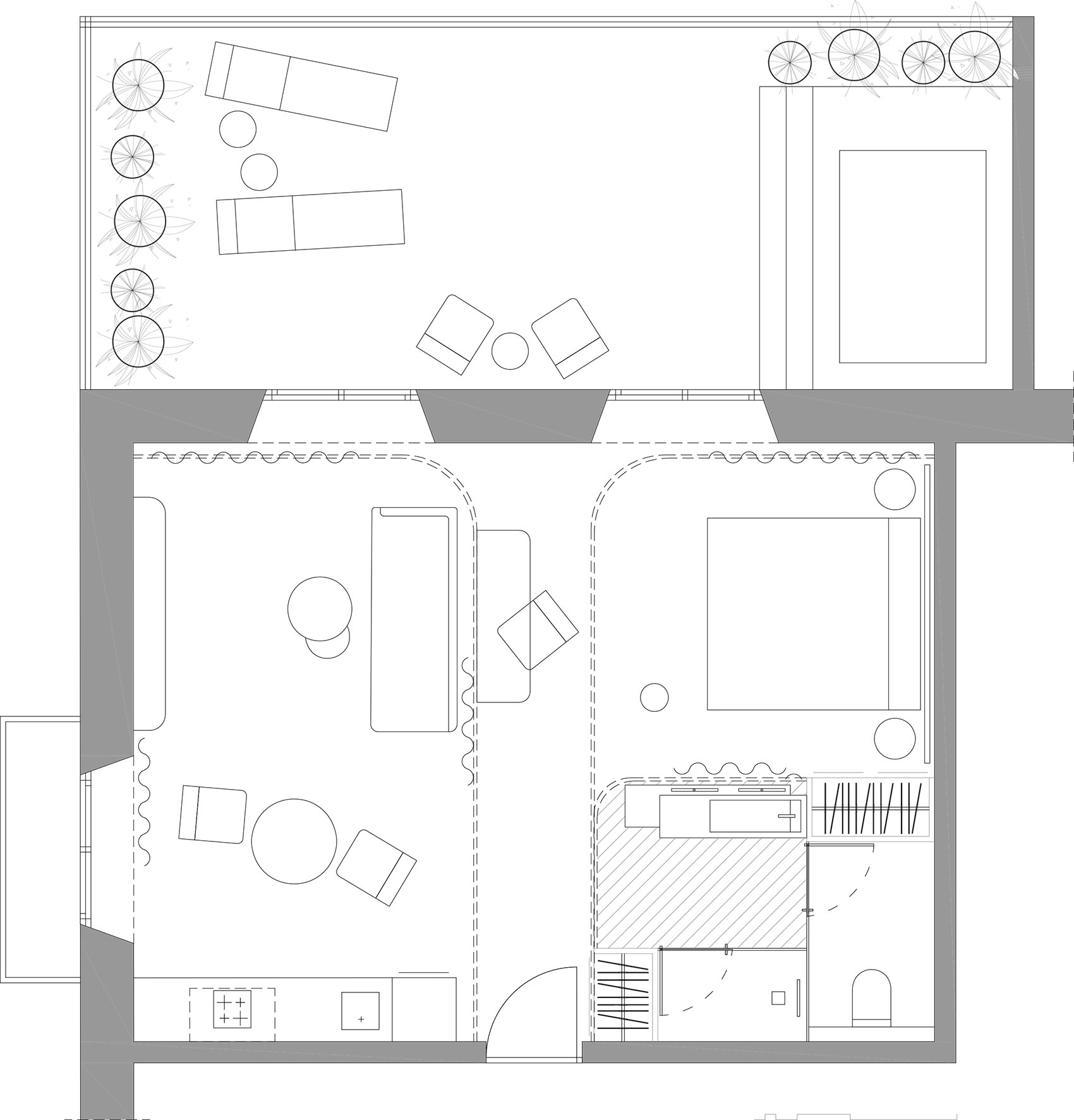 The apartment is characterized by being a unique, diaphanous and multipurpose space, which adapts to different needs through the strategic use of curtains. These allow the space to be divided and reorganized as needed, offering a flexibility that varies between a more social environment and a more intimate or private area. This design solution not only provides versatility, but also maximizes the entry of natural light, generating a warm and luminous environment that highlights the earth and green tones, so characteristic of the city. Natural light enhances the feeling of spaciousness and connection with the outdoors, making the space feel cozy and in harmony with its surroundings.
