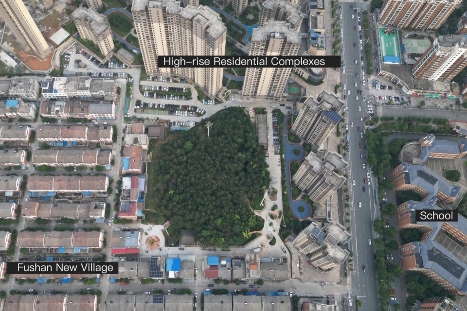 项目位于湖北省咸宁市的市区,北侧紧邻浮山新村,南面是一所包含小学和初中的九年一贯制学校,西侧为高层住宅小区与商业街,山丘上则生长着一片自然演替的马尾松林。当地村民对这片松林怀有深厚情感,明确要求公园在设计与施工过程中不得砍伐山上的松树。与此同时,村民、高层住宅中的城市居民以及学校的学生都将从不同方向进入或穿越这座小公园,新的公共空间因此需要充分兼顾各方使用者的需求。