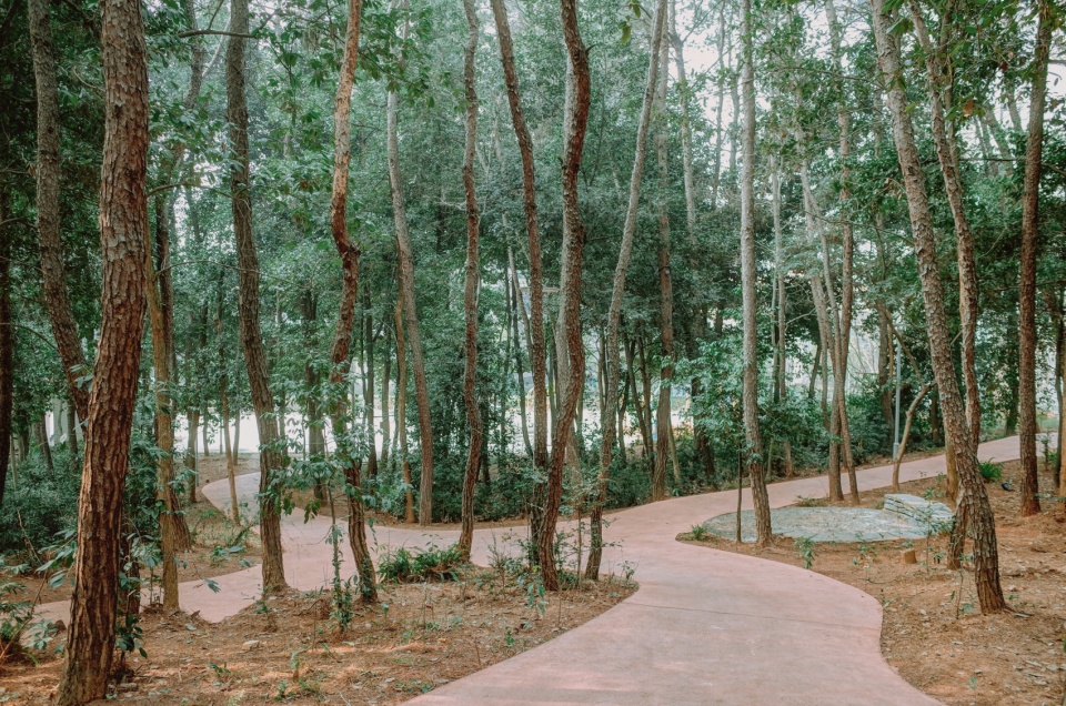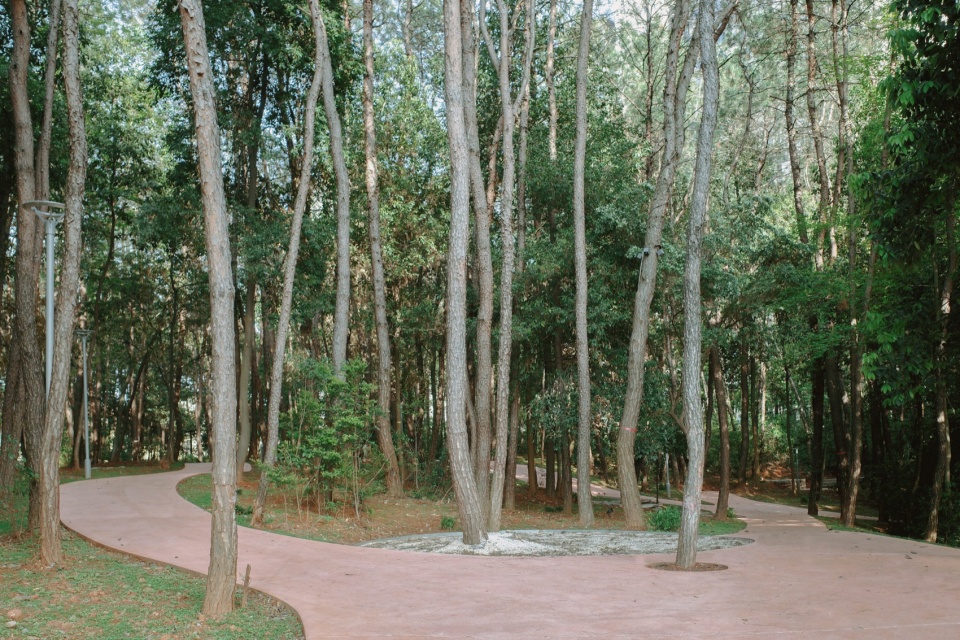 Inside the pine forest, scattered patches of crushed stone paving and ecological soil paving do not indicate clear routes but are intended to enhance a sense of wandering and exploration. Linear low walls trace the contours of the hill, with pale lines emerging and disappearing among the trees, while also providing a sense of orientation. Because the natural Masson pine forest is fragile and susceptible to pine wilt disease, the project introduced seedlings of native Masson pine mixed forest to adjust and establish a rational tree species composition. By increasing understory biodiversity, the pine forest’s resistance to pests and disasters has been strengthened.